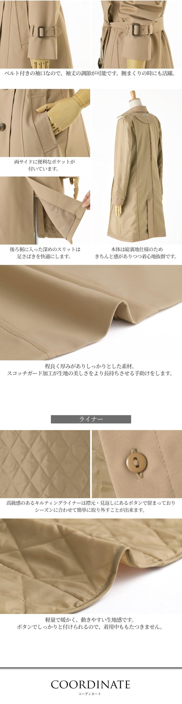 | 総裏地 裏地付き スリット ヨーク バックルベルト 袖口ベルト ポケット付き シンプル ベーシック ライナー付き ロング丈 レギュラー丈 | |