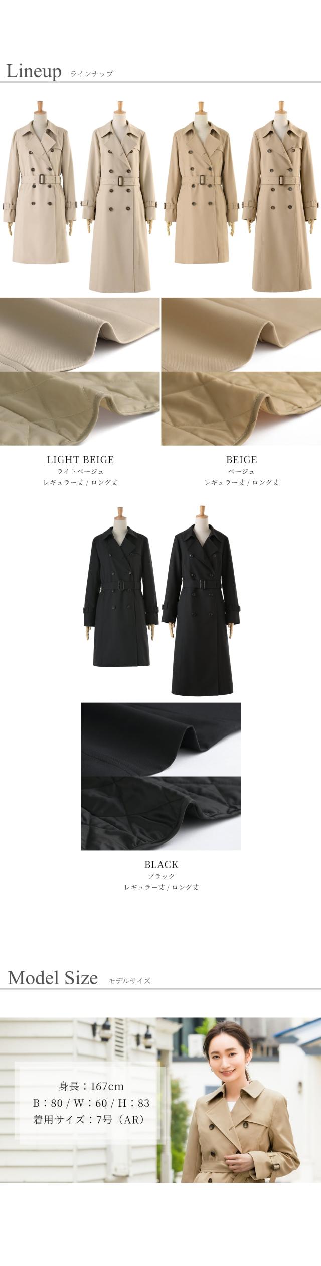 説明 | 長く使える!ライナー付きのトレンチコート。 流行に左右されない定番のデザインを採用。 レギュラー丈とロング丈をご用意しました。 シンプル・ベーシックなデザインなので、通勤やビジネス、就活・転職活動のアウターとしてはもちろん、 七五三やお宮参りのフォーマルシーンに、きれいめスーツと合わせて着用しても◎ シーンを選ばずにご着用いただけます。 もちろん、普段のカジュアルなお洋服に合わせてもOK! 付属ベルトは適度な長さがあるので、リボン結びや固結びなどのアレンジも自在。 その時々に合わせた着方をお楽しみいただけます。 トレンチコート本体は、適度な厚みがある生地を使用。 若干のハリがあり、キレイに着こなすことができます。 総裏地のおつくりなので、きちんと感がありつつ着心地も抜群です。 また、本体生地には「スコッチガード加工」が施されており、雨や花粉、汚れからコートを保護。 キレイが長持ちする手助けをします。 【スコッチガード特性】 ・雨や水をはじきやすいはっ水(撥水)効果 ・花粉がつきにくく落ちやすい花粉ガード効果 ・汚れを防止し、キレイが長持ち コート内側には、取り外し可能なキルティングライナーが付いています。 ボタンで簡単に着脱ができるので、その日の気温に合わせてお出かけ前にサッと調整が可能です。 春や秋の温かい日から寒い冬まで長期間ご着用いただけます。 綿入りのライナーは驚くほど軽量で、身体への負荷を軽減します。 ボタンでしっかりと固定ができるので、着用時ももたつかず、スッキリとしたシルエットで着こなせます。 着心地・デザイン・機能面すべてにおいてこだわった、ELENAオリジナルのトレンチコートです。 |
