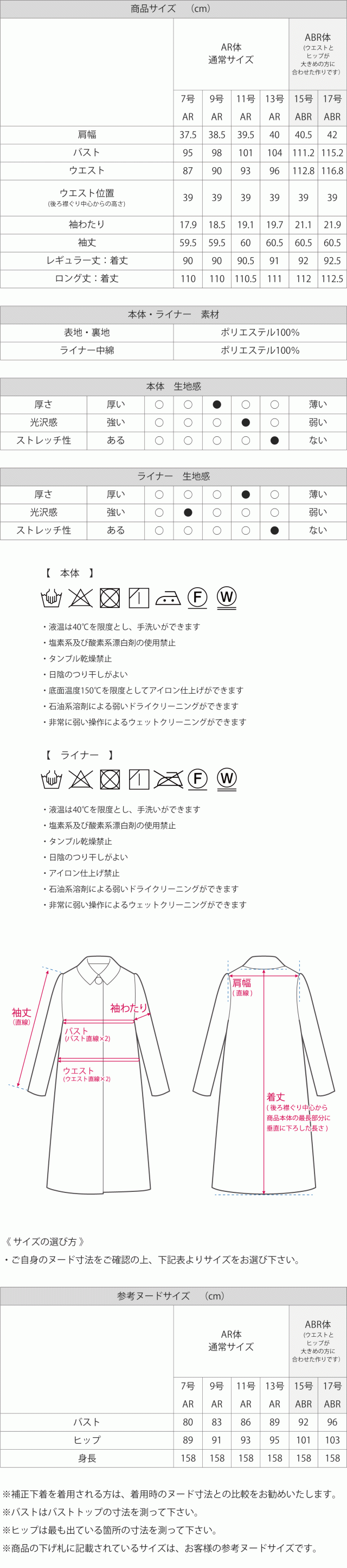 | 表地・裏地・ライナー:ポリエステル 100% | |