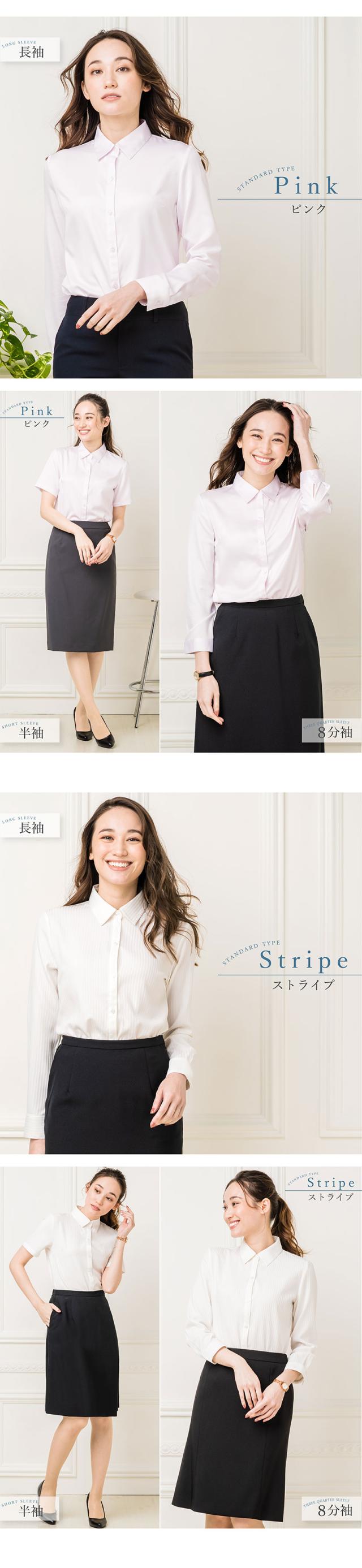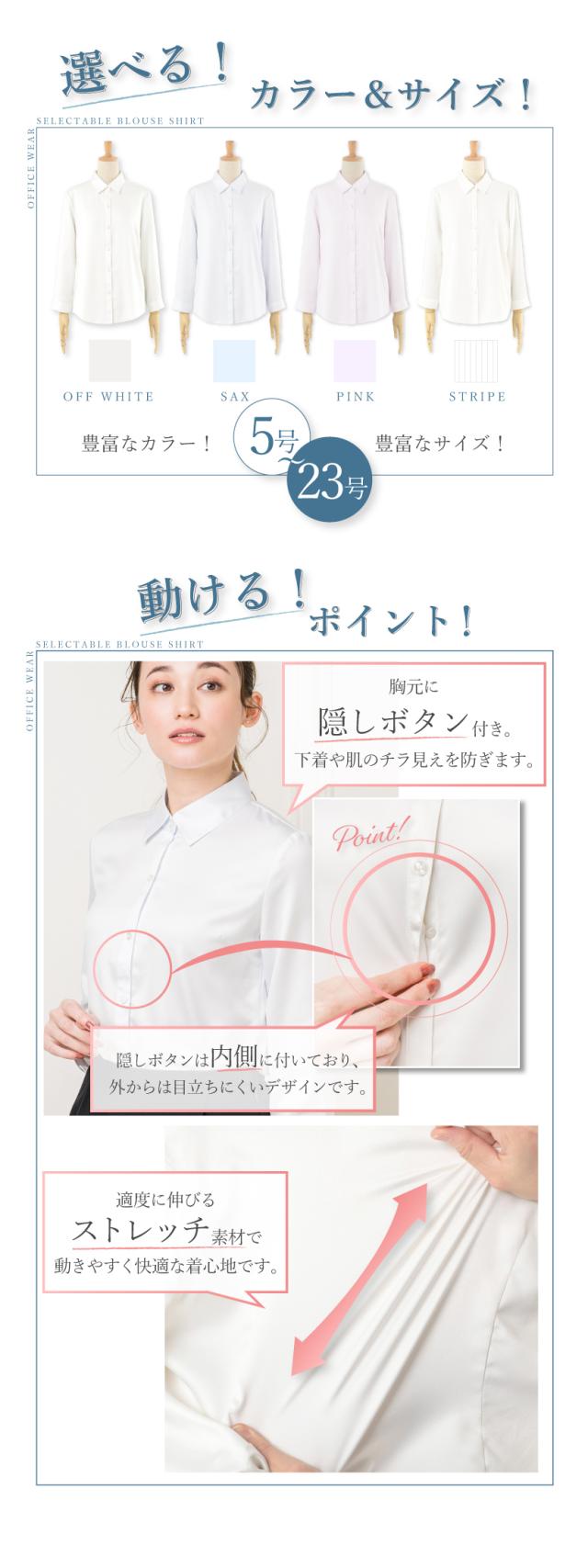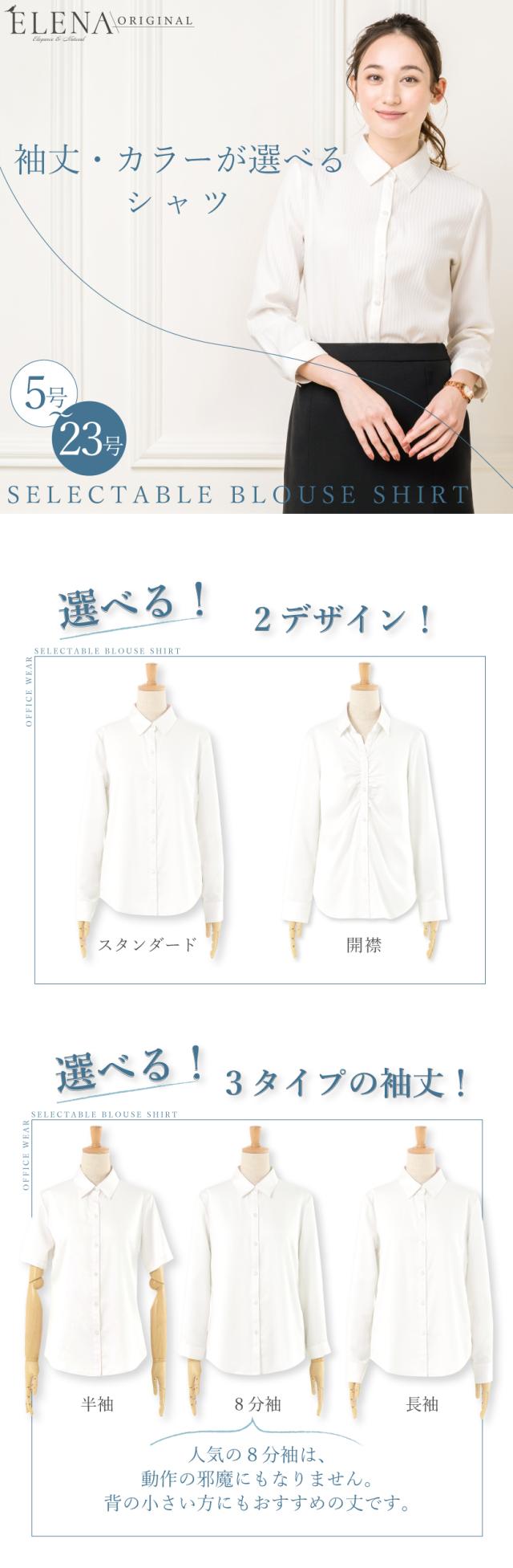 機能性、品質にとことんこだわり、エレナオリジナルのシャツブラウス。襟の形がベーシックな「スタンダード」と適度に開いた「開襟」の2種類からお選びいただけます。ご家庭の洗濯機で洗える嬉しい、ウォッシャブル素材。常に清潔な状態を保つことができます。しわになりにくく、イージーケアで美シルエットをキープ!ストレッチが効いており、動きやすく快適な着心地です。さらに、紫外線遮蔽率が90%以上の強力なUVカット生地を採用。日焼けからお肌を守ります。胸元のチラ見え防止用に内側に隠しボタンがついており、腕を大きく開いても胸元の開きが気にならない!生地は若干光沢のある滑らかな生地。ストレッチが効いて腕の動きが気になりません。袖丈を半袖、8分袖(八分袖)、長袖から選べます!今、人気の八分袖は仕事の邪魔にならず、手を洗う際に腕まくりしなくてもいい優れもの!また背の小さい方など長袖が長すぎて気になる方にもおすすめです。カラーは、ホワイト・サックス・ピンク・ストライプの4色をご用意致しました。サイズも豊富な11サイズ展開なので、ぴったりの一枚をお選びいただけます。