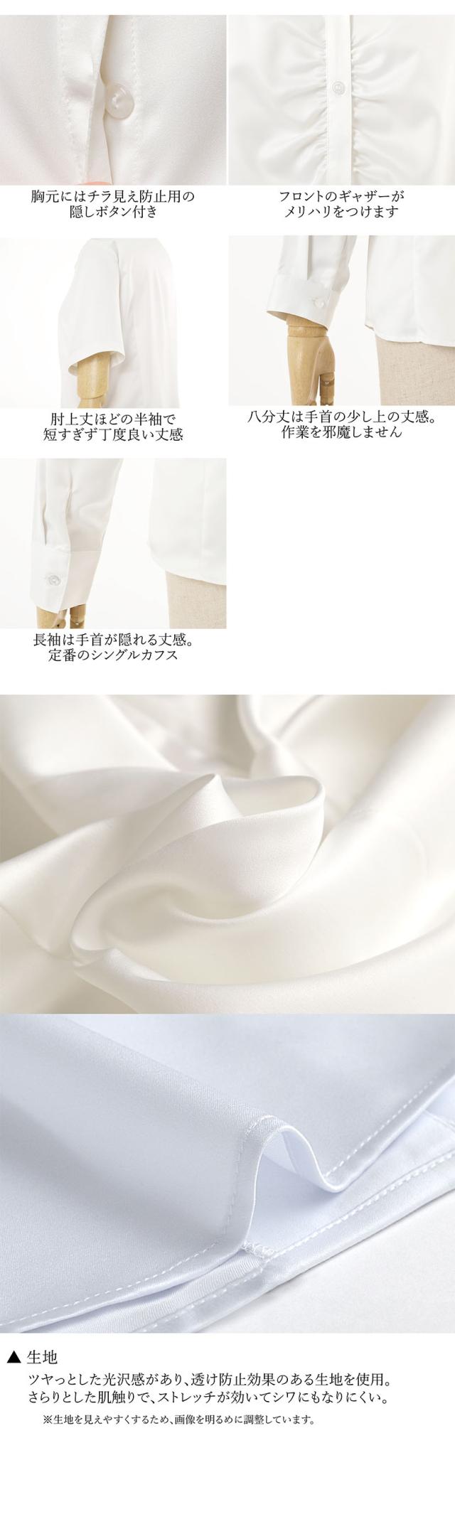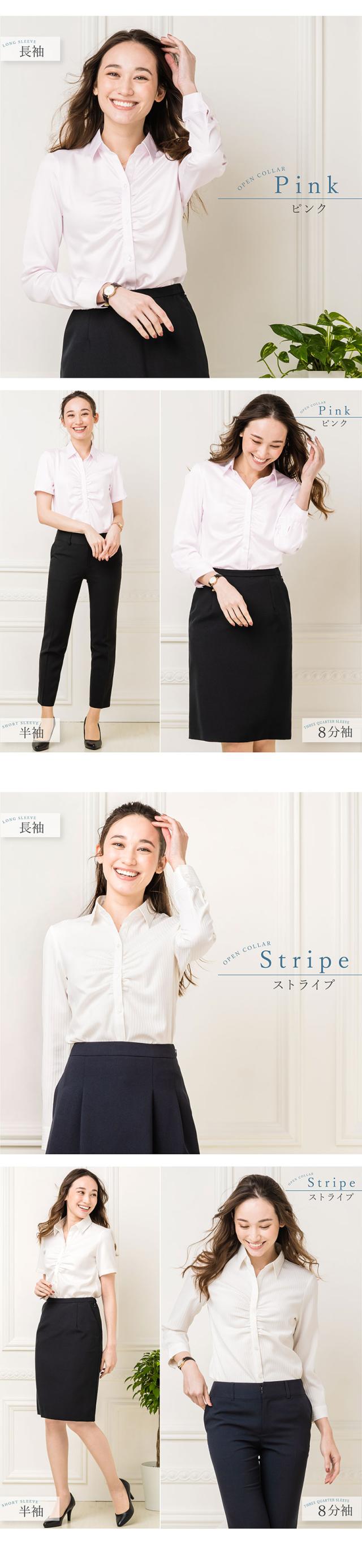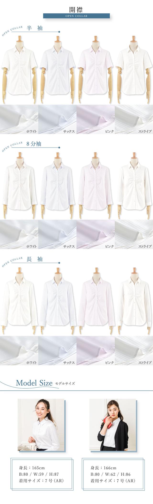 | ギャザー スタンダート 開襟 隠しボタン チラ見え防止 無地 ストライプ 半袖 8分袖(八分袖) 長袖 | |