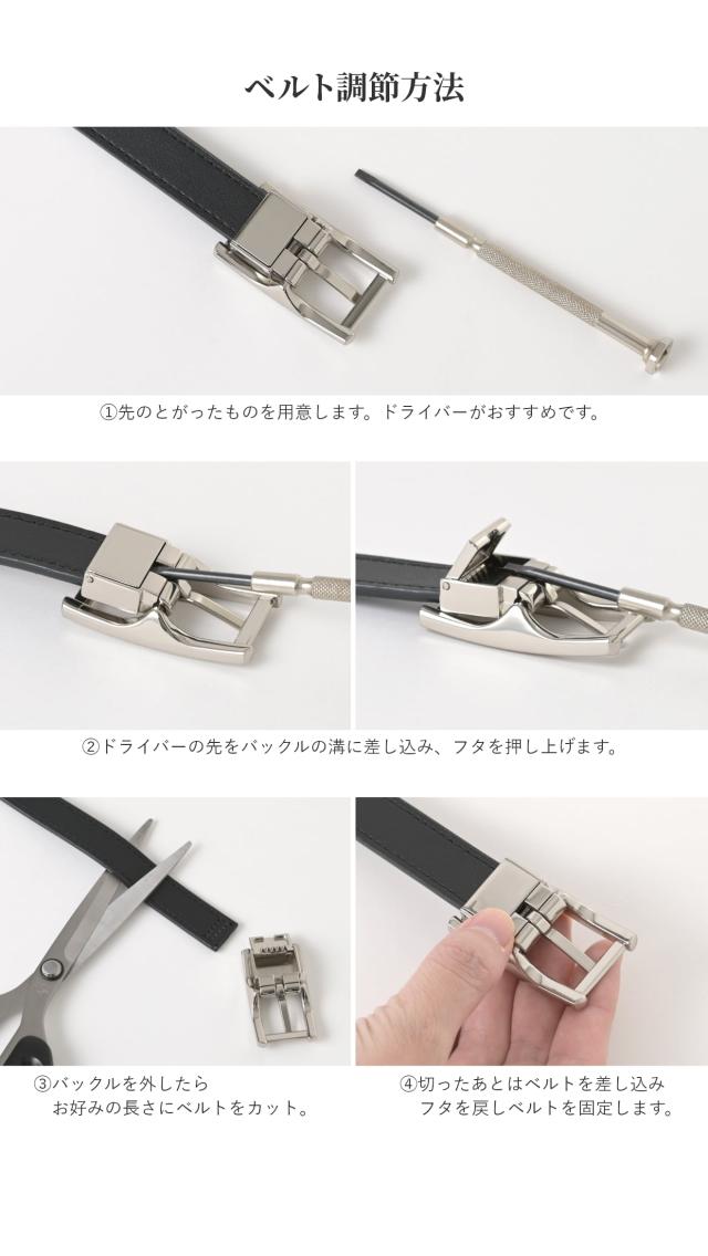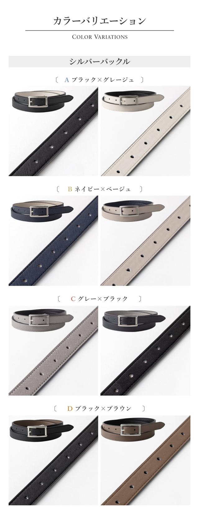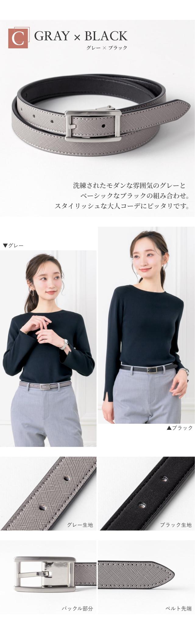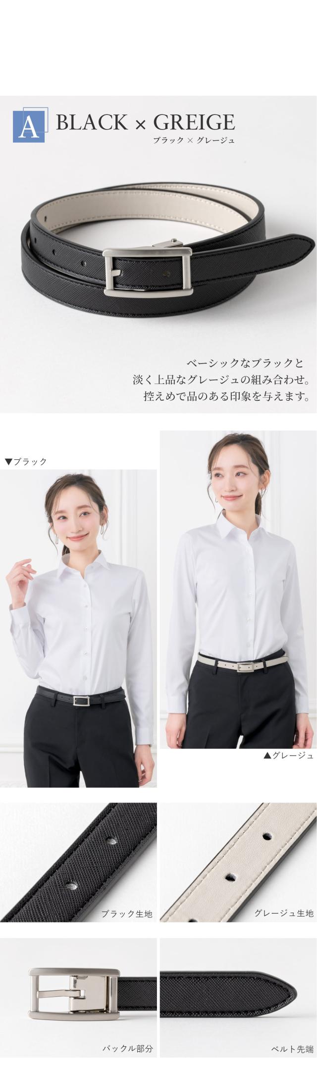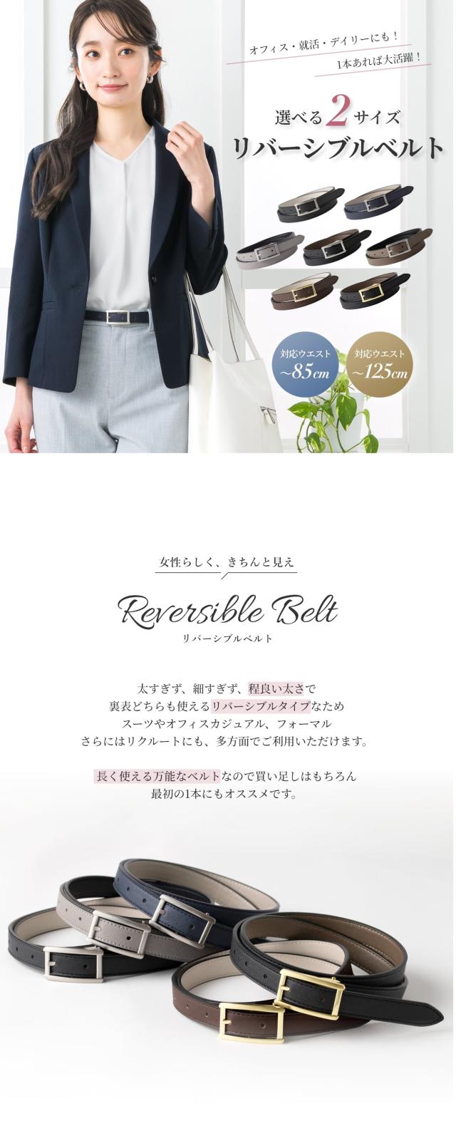 | バックル部分をひっくり返すだけで簡単に色を変えられる便利なリバーシブルタイプ。 太すぎず、細すぎずな程良い太さで、スーツやオフィスカジュアル、フォーマル、さらにはリクルートにも、多方面でご使用いただけます。 ベルトの長さはお好みや体型に合わせて2サイズからお選びいただけ、最大でウエスト約125cmまで対応可能。 また、ウエストサイズは調節が可能で、バックルを取り外しベルトを切ってご自身の好みに合わせた長さに変更できます。 どのカラーも落ち着いた色合いでどんなお洋服にも合わせやすいデザインです。 急なビジネスシーンでも重宝するのは、ブラックの面があるベルト。 就職活動にも使用予定であれば、シルバーバックルが大変便利です。 長く使える万能なベルトなので買い足しはもちろん、最初の1本にもおすすめです。 | |