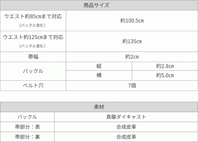 | 全長約100.5cm (ウエスト約85cmまで対応) 全長約135cm (ウエスト約125cmまで対応) | |