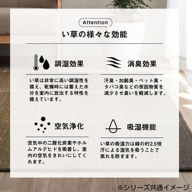 | 素材・材質 | 表地:い草(普通織) 中材:ウレタン5mm 裏地:ポリエステル100%【滑り止め不織布】 ヘリ:ポリエステル100% |