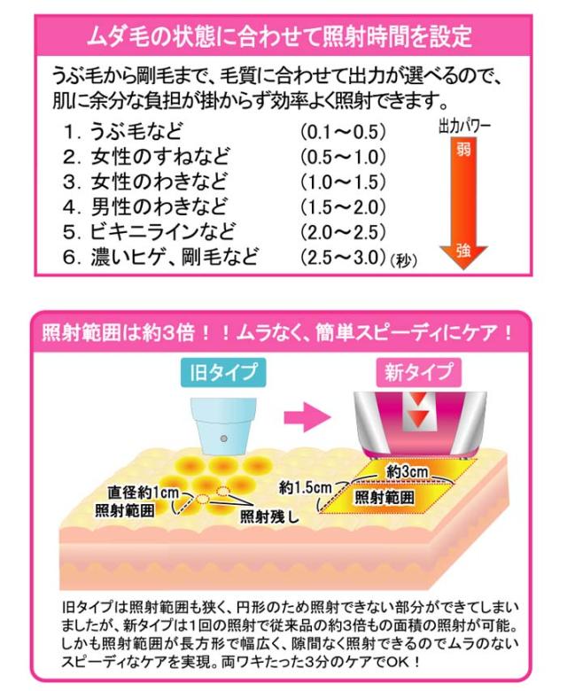 | 【特徴】 ●剃っているだけのケアじゃ意味がない! 最先端のムダ毛ケアで1ランク上の美しいツルツル肌に! ●エステで最先端の脱毛法! キセノンフラッシュ+ラジオ波(RF)の同時照射でさらに効果UP! ●ラジオ波の熱エネルギーで毛質に関係なく、安定的なダメージが可能に! ●キセノンフラッシュのダブルの光の熱エネルギーでムダ毛のメラニン色素に反応させ、強力ダメージ! ●ダブルフラッシュとRFのトリプルアクションにより、色素の濃い剛毛から薄い産毛まで、 お肌の負担を最小限に抑えながら、強力で安定的なダメージが可能に! ●フラッシュの波長はエステ機器並の脱毛に適していると言われる、約600nm〜1000nmを採用。 ●1回の照射範囲は30×15mmと長方形で幅広いのでムラのないスピーディなケアを実現! ●顔、ワキ、腕、ビキニライン、脚など全身ケアOK! 両ワキわずか3分のスピーディケア!! 【商品説明】 人気の機種が従来品よりさらにパワーアップ! Wフラッシュ&ラジオ波の最先端の技術でムダ毛にダメージ! 最大3秒間照射できるフラッシュに連発照射のフラッシュを同時に重ねて照射! 肌の表面温度は従来と同じままで最小限に抑えながら、ムダ毛にダメージ! さらに新機能として、脱毛の定番、RF(高周波)を追加! 電気による熱エネルギーでダメージを与えるため、ムダ毛の色素に関係なく、安定してダメージを与えます。 現在エステ最先端のムダ毛ケアです! Wフラッシュ+高周波の相乗的に働き、トリプルアクションにより気になる様々なムダ毛の発毛をセーブ。 また、ムダ毛だけでなく美肌にも効果期待ができ、ムダ毛オフのスベスベ肌に! 【使い方は簡単!】 予め照射したい部分の毛を処理してから、照射面を肌に密着させて照射ボタンを押すだけ。 週に2〜3回の使用が目安。 女性の産毛から男性の剛毛なスネ毛までダメージを与えます。 ワキ、腕、脚、ビキニラインなどに使え、顔にもOK! 繰り返しケアすることでツルツルの美肌を実感します! |