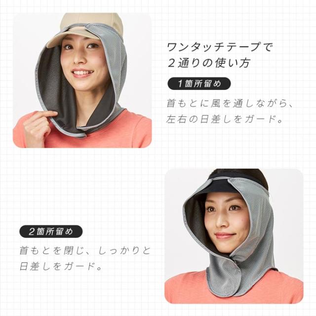 | ※帽子の上からかぶせ、首もとのワンタッチテープを留めてご使用ください。 ●ワンタッチテープ2箇所留め:首もとを閉じしっかり日差しをガード ●ワンタッチテープ1箇所留め:首もとに風が通り左右の日差しをガード | |