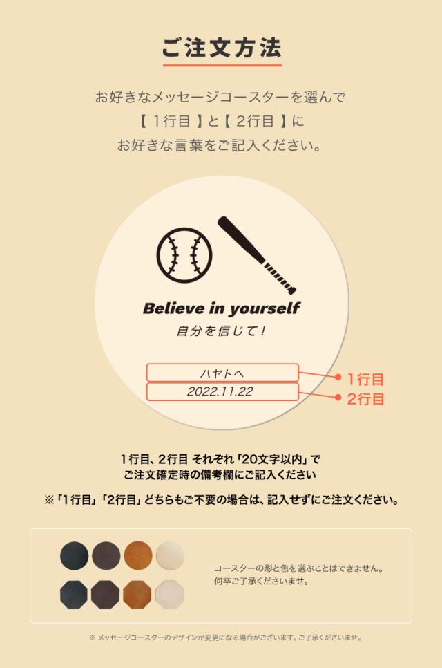 さまざまなシーンにあわせたメッセージに、日付やお名前などを刻印いただける オリジナル本革コースターをご用意しております。