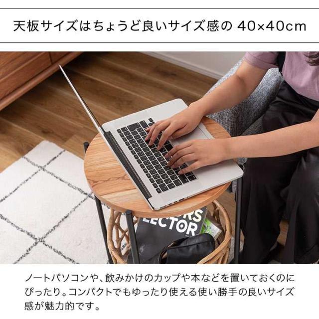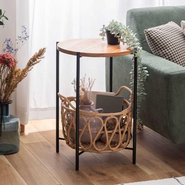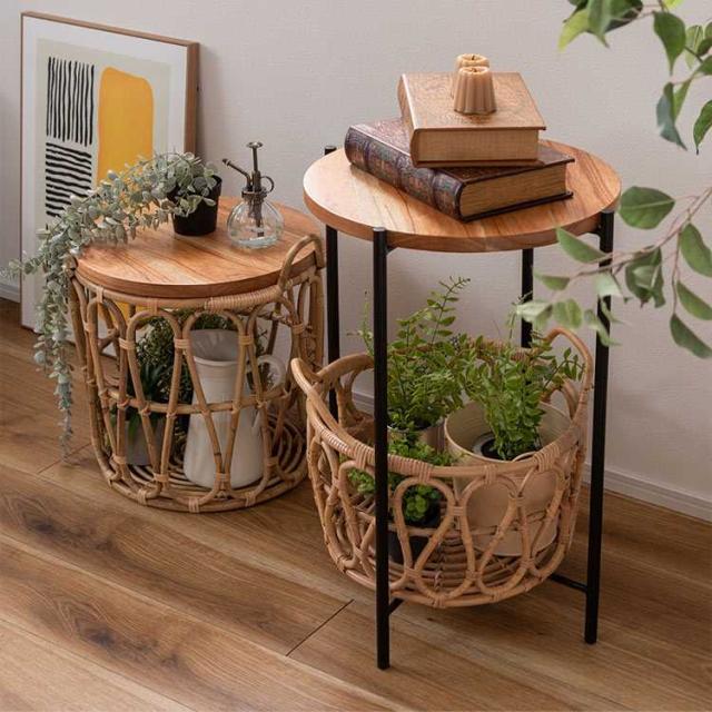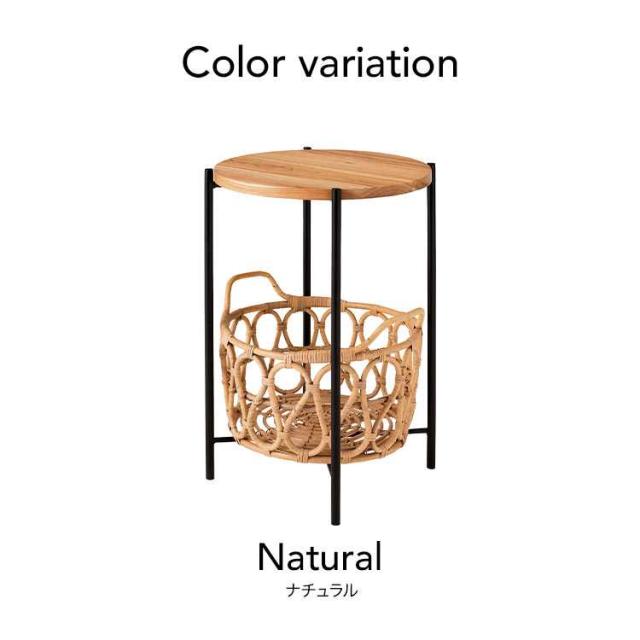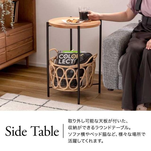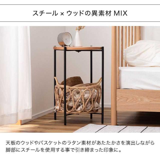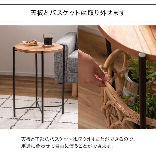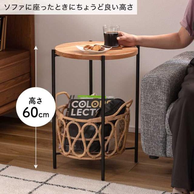 サイドテーブル 丸型 おしゃれ ラタン 円形 60cm ソファサイド ベッドサイド ミニテーブル ナイトテーブル ラウンドテーブル コーヒーテーブル ラタンテーブル 机 小さめ バスケット付き 収納 天然木 木製 籐 スチール 天板 寝室 リビング ダイニング 一人暮らし ナチュラル