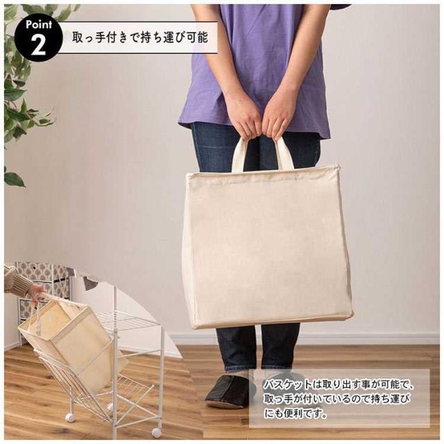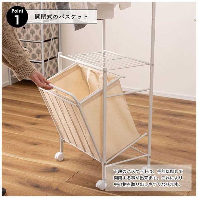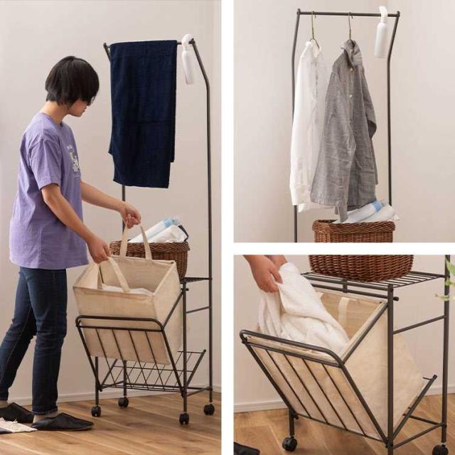 掛ける・収納するが同時にかなうシンプルなランドリーハンガー。バスケットは開閉式で取り出すこともできるので持ち運びにも最適。キャスター付きなので簡単に移動ができます。下段のバスケットは手前に倒しての開閉が可能なので、中の物が取り出しやすい設計に。バスケットは取り出す事ができ、取っ手も付いているので持ち運びに便利。中段には、小物などを置いておくのに便利な棚板付き。ハンガー部分はシンプルでスタイリッシュなデザイン。