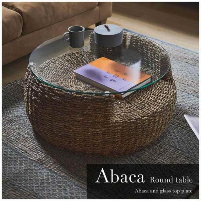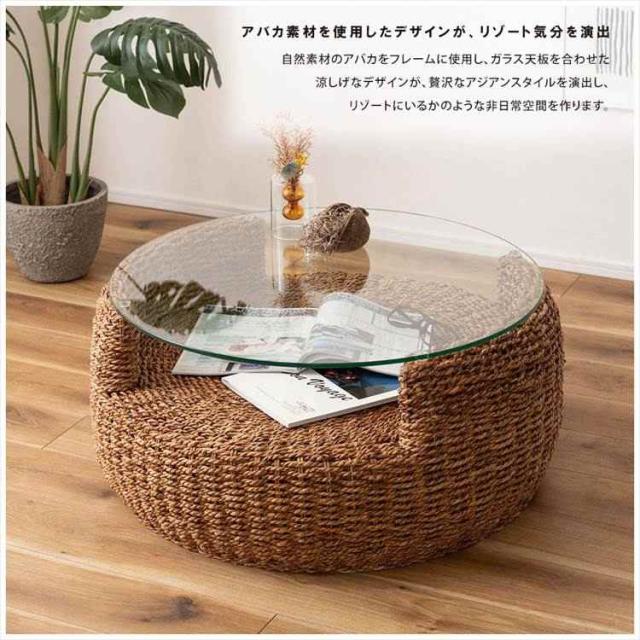 こちらのローテーブルは、アバカ素材を使用したデザインで、まるでリゾートにいるかのような非日常空間を演出します。自然素材のアバカを使用し、ガラス天板を組み合わせた涼しげなデザインが、贅沢なアジアンスタイルをお部屋に届けます。