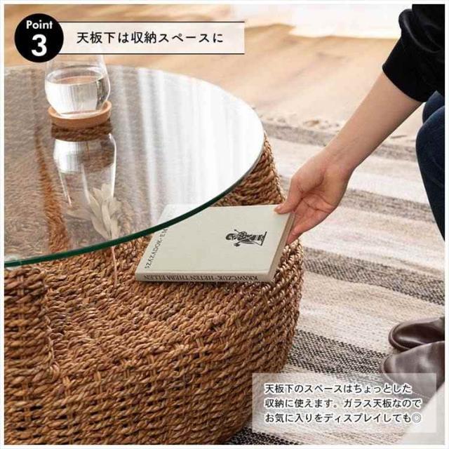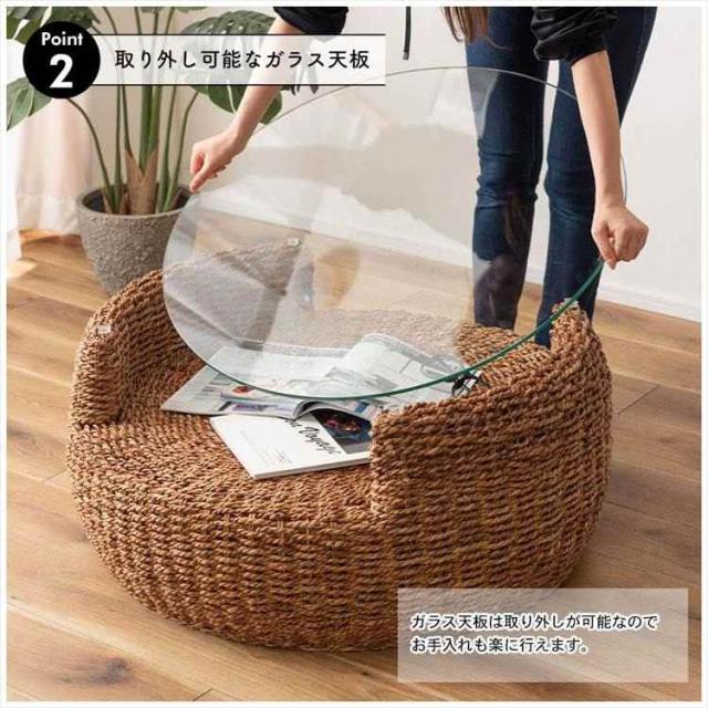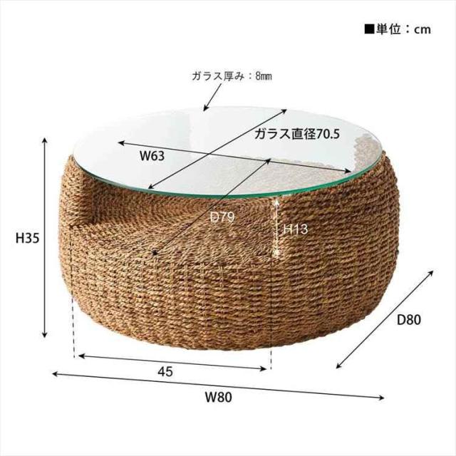 ローテーブル センターテーブル ガラステーブル 丸型 丸い 円形 収納棚 幅80cm 高さ35cm おしゃれ アバカ 天然素材 リゾート ラウンジ アジアン ナチュラル NRS-550 リビング 客間 ディスプレイテーブル 雑誌 小物 収納付き ガラス 麻 リネン ホテル風 机 つくえ インテリア