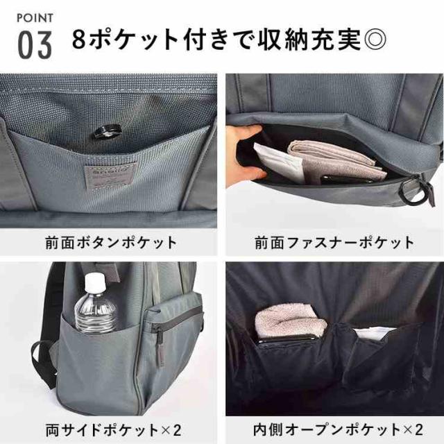 8つの収納ポケット付きで収納力◎背負ったままメインポケットにアクセスできる背面ファスナーも。