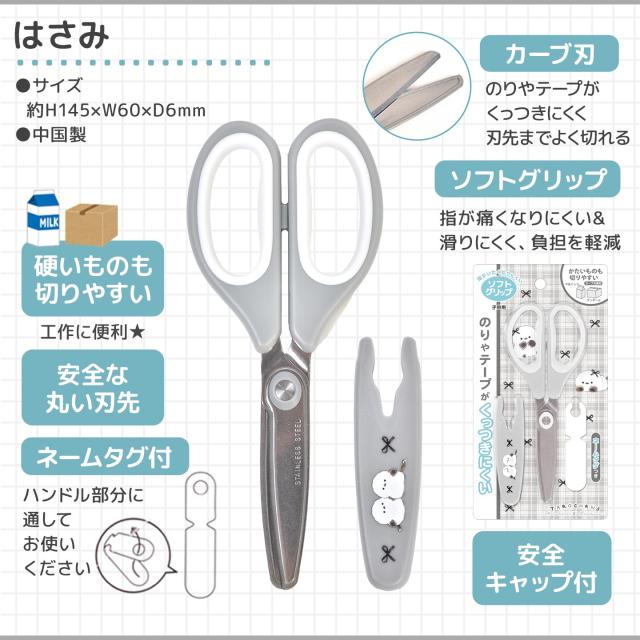 ・はさみ:約H145×W60×D6mm、ソフトグリップ、ネームタグ付き、安全キャップ付き、中国製