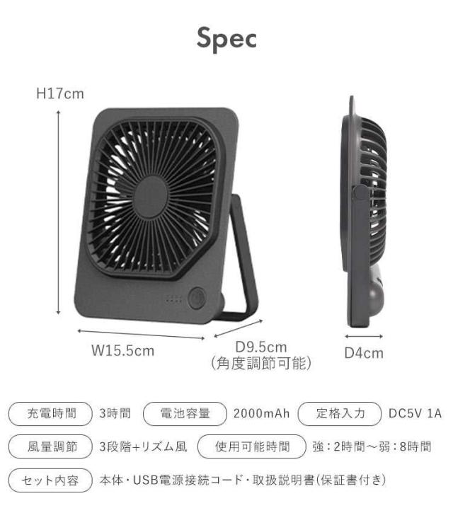 ■使用時間(約):強/2時間、中/4時間、弱/8時間(満充状態から使用/室温25℃)