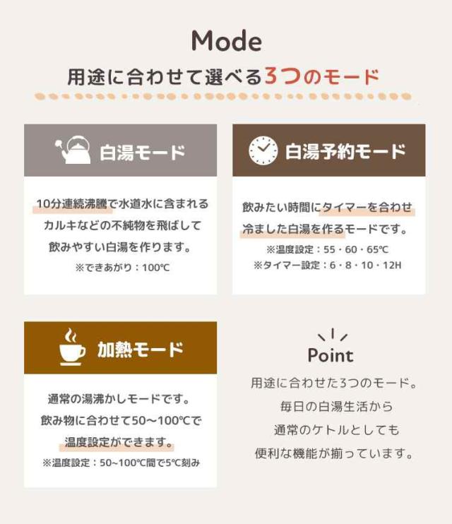 まいにち続けたい温活『白湯』が電気ケトルで簡単に作れる!10分の連続沸騰でカルキを飛ばす『白湯モード』や、時間と温度を指定して白湯を作れる『白湯予約モード』を搭載した、忙しい日々にぴったりの『白湯専科』電気ケトル。50度〜100度間の温度調整や保温機能など、通常のケトルとしての機能も充実!不純物を飛ばして温度を調節できるので、美味しいコーヒー、お茶などはもちろん赤ちゃんのミルク作りなどにも便利です。