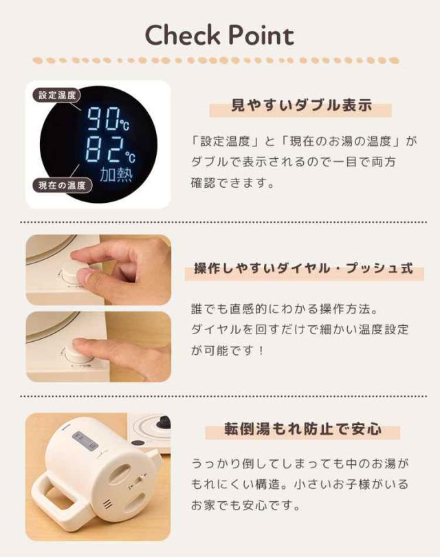 Details 【白湯専科電気ケトル】 まいにち続けたい温活『白湯』が電気ケトルで簡単に作れる!10分の連続沸騰でカルキを飛ばす『白湯モード』や、時間と温度を指定して白湯を作れる『白湯予約モード』を搭載した、忙しい日々にぴったりの『白湯専科』電気ケトル。50度〜100度間の温度調整や保温機能など、通常のケトルとしての機能も充実!不純物を飛ばして温度を調節できるので、美味しいコーヒー、お茶などはもちろん赤ちゃんのミルク作りなどにも便利です。転倒してもお湯がこぼれにくい構造でお子様やペットがいるご家庭でも安心。ナチュラル・シンプルなデザインはプレゼントにもぴったりです。 ブランド名 DOSHISHA / ドウシシャ 品番 EKZ-102M サイズ 本体:約W22.5×D19.0×H21.5cm(電源ベース含む) 電源コード:約70cm 容量 約1.0L 重量 約1.0kg(電源ベース含む) 仕様 電源:AC100V 50/60Hz 定格消費電力:1000W 運転モード [加熱モード]温度設定:50〜100℃ [白湯モード]連続沸騰:約10分 [白湯予約モード]時間設定:6〜12時間、温度設定:55〜65℃ 付属品 ・本体 ・電源ベース(コード70cm) ・取扱説明書(1年保証付き) 生産国 中国 ご注意 ※表記サイズより、多少の誤差があることがございます。 ※商品の画像はできる限り実物に近づけるよう配慮しておりますが、お使いのモニターやご覧になる環境によりましてはカラーの見え方に差が出る場合がございます。ご了承くださいませ。 関連キーワード 白湯専科電気ケトル 白湯専科 電気ケトル 温度調節付き 白湯 さゆ さ湯 ミルク カルキ抜き 保温 機能付き 温活 グッズ おしゃれ かわいい 1L ドウシシャ ON℃ZONE オンドゾーン EKZ-102M 温度設定 予約 電気ポット 湯沸かし器 湯冷し コーヒー ドリップ 紅茶 お茶 美味しい 赤ちゃん 粉ミルク 転倒防止 安全 洗える 1.0L 1000ml 魔法瓶 オフィス ダイエット 健康 朝活 引っ越し 結婚 新居 お祝い 引っ越し祝い 一人暮らし 新生活 オフィス 誕生日 プレゼント ギフト シンプル 北欧 グレー アイボリー ピンクベージュ 白 ホワイト 20代 30代 40代 50代 60代 70代 80代 大学生 学生 息子 娘 孫 女性 女子 レディース 男性 男子 ボーイズ 父 母 おかあさん おとうさん パパ ママ シニア おじいちゃん おばあちゃん お爺ちゃん お婆ちゃん 祖父 祖母 じいじ ばあば バースデー お祝い 粗品 景品 送別会 イベント 母の日 父の日 敬老の日 クリスマス クリスマスプレゼント バレンタイン チョコ以外 ホワイトデー オシャレ お洒落 可愛い カワイイ シンプル かっこいい カッコいい カッコイイ | |||||||||||||||||