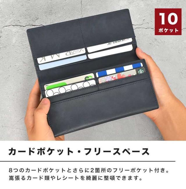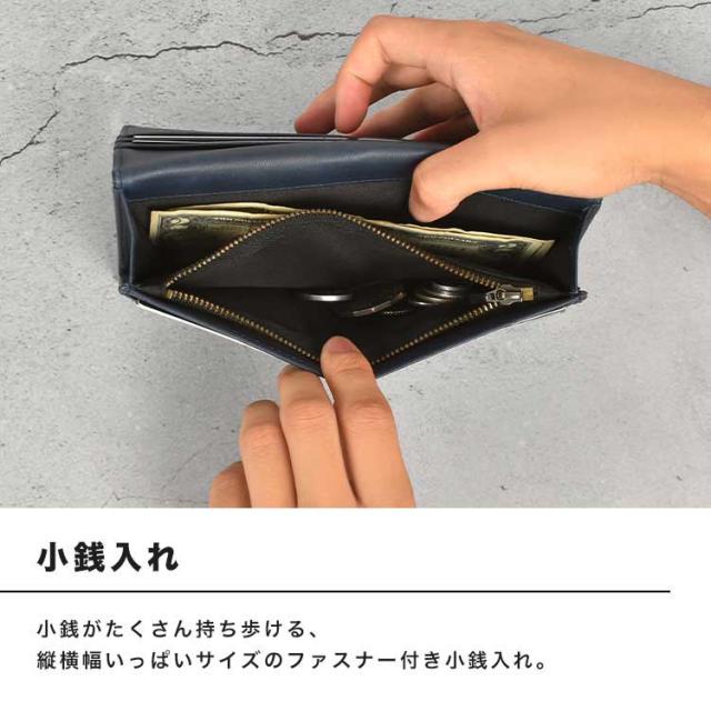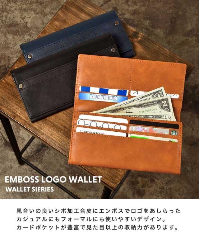風合いの良いシボ加工合皮にエンボスでロゴをあしらった カジュアルにもフォーマルにも使いやすいデザイン。 スリムな形状ですがカードポケットが豊富で、二つ折りでも見た目以上の収納力があります。 高級感があり、ボックスもついているのでプレゼントやギフトにも最適です!