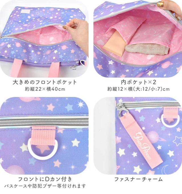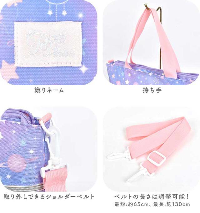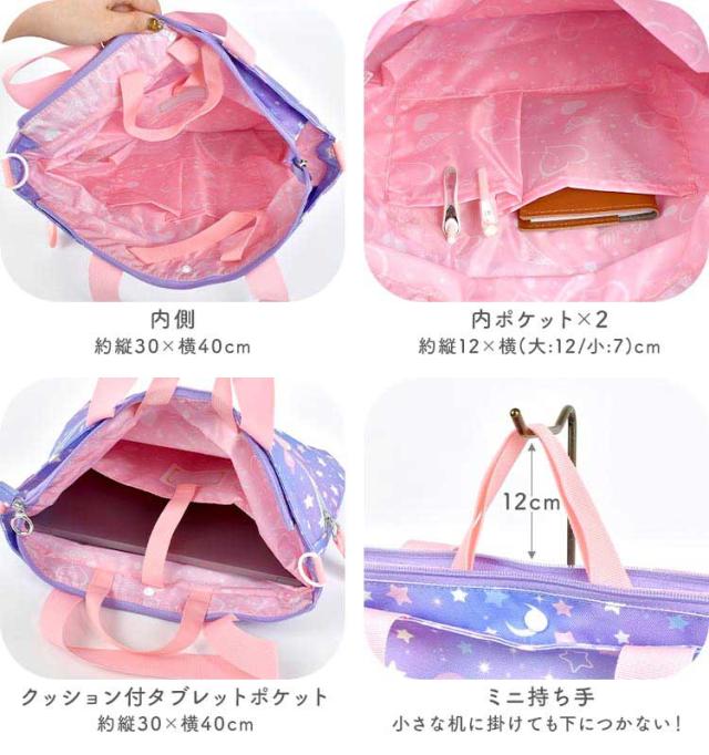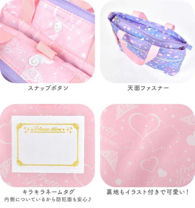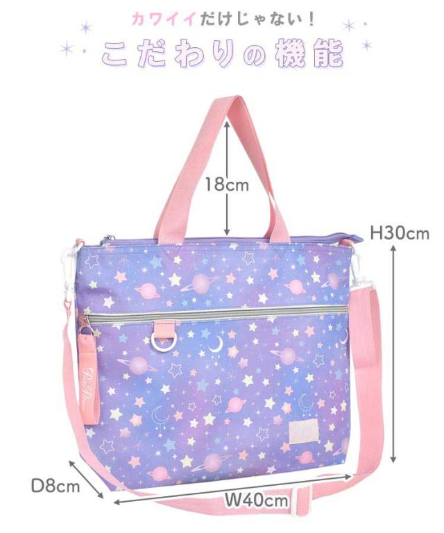 女の子の好きが詰まったレッスンバッグが登場! まるでお姫様の気分になれちゃいそうなカワイイデザインも? 取り外しできるショルダーベルト付きなのでショルダーバッグとしても使える2way仕様! 机に掛けても下にバッグがつかないようにしてくれるミニ持ち手や、タブレットを収納できるタブレットポケットなど 嬉しい機能が詰まったレッスンバッグになっています! 通学・通園バッグや、塾やお稽古用のバッグにオススメ♪