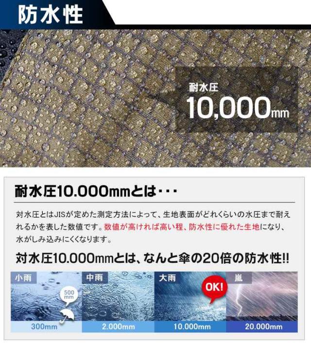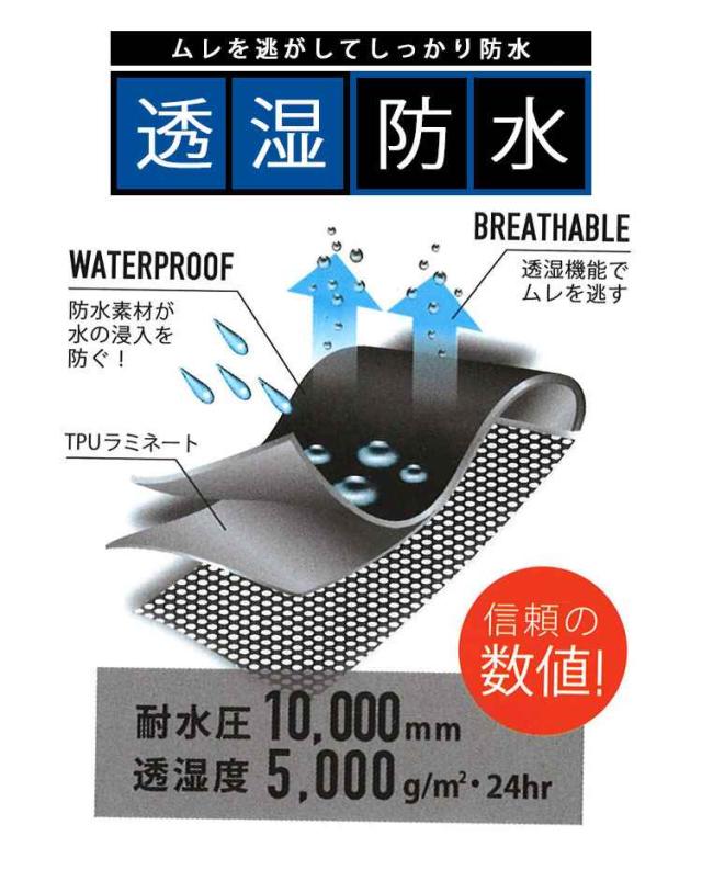| 素材 | 表地 :ポリエステル100%(TPUラミネート) 裏地 :ポリエステル100%(総裏メッシュ) 耐水圧10,000mm 透湿5,000g/24hr | |||||||