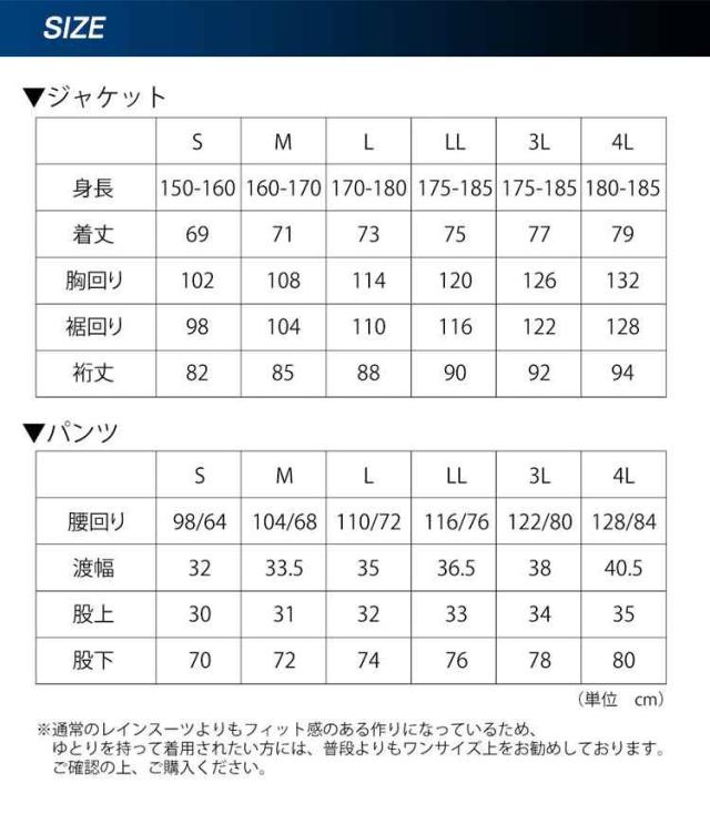 | サイズ | 適応身長 [S]150-160/[M]160-170/[L]170-180 [LL]175-185/[3L]175-185/[4L]180-185 ジャケット [S]着丈69/胸回り102/裾回り98/裄丈82cm [M]着丈71/胸回り108/裾回り104/裄丈85cm [L]着丈73/胸回り114/裾回り110/裄丈88cm [LL]着丈75/胸回り120/裾回り116/裄丈90cm [3L]着丈77/胸回り126/裾回り122/裄丈92cm [4L]着丈79/胸回り132/裾回り128/裄丈94cm パンツ [S]腰回り98-64/渡幅32/股上30/股下70cm [M]腰回り104-64/渡幅33.5/股上31/股下72cm [L]腰回り110-72/渡幅35/股上32/股下74cm [LL]腰回り116-72/渡幅36.5/股上33/股下76cm [3L]腰回り122-80/渡幅38/股上34/股下78cm [4L]腰回り128-84/渡幅40.5/股上35/股下80cm | |||||||