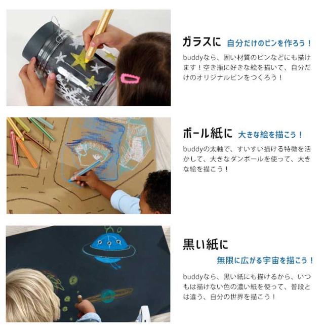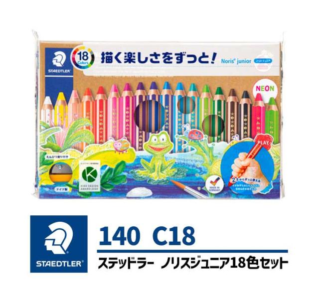 Details ノリスジュニア色鉛筆 色鉛筆を製造販売して160年以上の歴史を持つステッドラーが子どものために本気で開発した色鉛筆。色鉛筆の常識を超える滑らかさでクレヨンのような描き心地、描いたものをそのまま活かすことはもちろん、描いた上を水を含ませた筆でなぞれば水彩色鉛筆にもなる1つで3パターン楽しめる製品です。ドイツの厳しい安全基準(en71)に適合しており、さらに2歳から使えるという今までありそうでなかった対象年齢の幅の広さも特長です。描くことに夢中になって気づいた時には紙を飛び出して描いていたとしても、水拭きや洗濯など水で洗い落とせるので安心してお使いいただけます。 ※材質や形状によっては落ちないものもあります。 ※バディ色鉛筆はノリスジュニア色鉛筆に製品名が変わりました。 ※専用鉛筆削り1個付き、筆1本付き ブランド名 STAEDTLER 品番 140 C18 サイズ 約265×172×30mm 重量 約380g 素材 [ケース]:紙 [外装]:pp 生産国 ドイツ 仕様 ◇黄、うすだいだい、オレンジ、赤、ピンク、ワイン、紫、るり、青、水色、トルコいし、黄緑、緑、こげ茶、黒、ネオングリーン、ネオンピンクの18色セット ◇専用鉛筆削り1個付き ◇8号筆1本付き ご注意 ※表記サイズより、多少の誤差があることがございます。 ※商品の画像はできる限り実物に近づけるよう配慮しておりますが、お使いのモニターやご覧になる環境によりましてはカラーの見え方に差が出る場合がございます。ご了承くださいませ。 関連キーワード バディ ノリスジュニア STAEDTLER buddy Noris junior 140 c18 六角軸 紙箱入り 画材 絵画 美術 2歳 3歳 4歳 5歳 6歳 小学 1年 2年 保育所 幼稚園 先生 学生 学校 入園 入学 準備 入園準備 入学準備 子ども 子供 こども キッズ ジュニア 赤ちゃん ベイビー 女子 女の子 ガールズ 男子 男の子 ボーイズ シニア おじいちゃん おばあちゃん お爺ちゃん お婆ちゃん 祖父 祖母 じいじ ばあば 誕生日 プレゼント プチ ミニ ギフト お祝い お返し 粗品 記念品 景品 送別会 イベント クリスマス クリスマスプレゼント 筆記用具 文房具 おもちゃ 玩具 | |||||