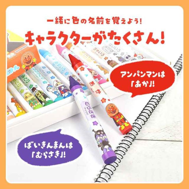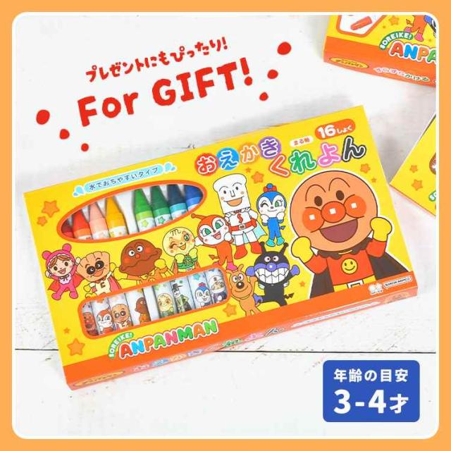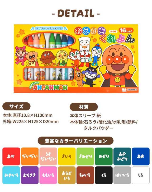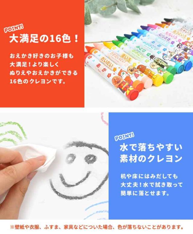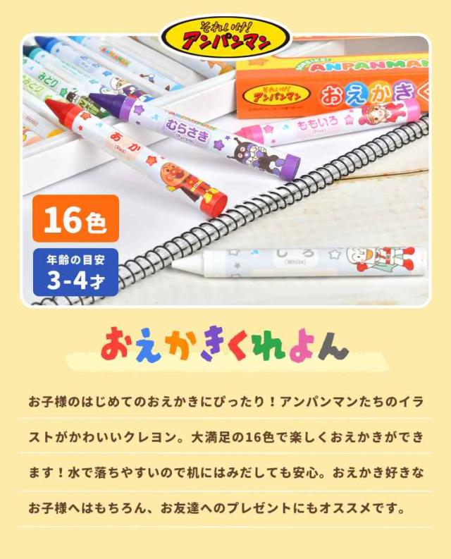 お子様のはじめてのおえかきにぴったり!アンパンマンたちのイラストがかわいいクレヨン。 おえかき好きのお子様も大満足の16色!それぞれ違ったキャラクターの絵が描かれているので、色の名前を覚えながら楽しく塗り絵やおえかきができます。 水で落ちやすいので机や床にはみだしても安心。 おえかき好きなお子様へはもちろん、お友達へのプレゼントにもオススメです。