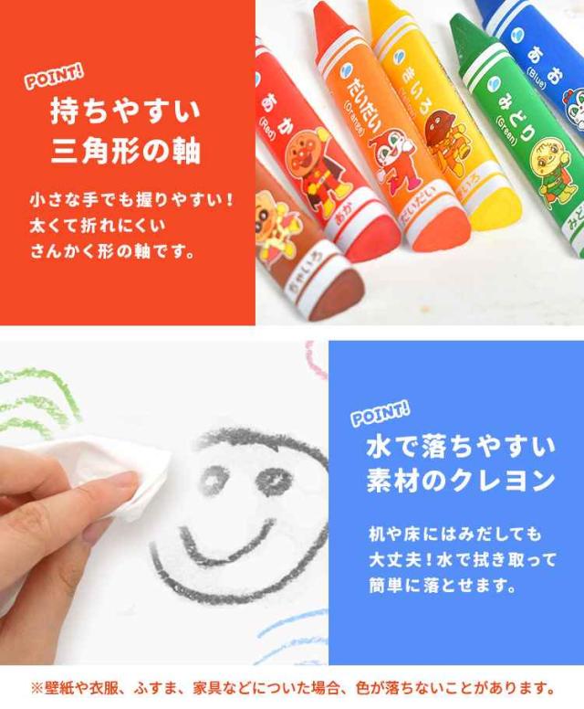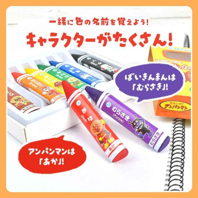 お子様お子様のはじめてのおえかきにぴったり!アンパンマンたちのイラストがかわいいクレヨン。 太めのさんかく軸は、小さなお子様の手でも握りやすく折れにくいのが特徴。 それぞれ違ったキャラクターの絵が描かれているので、色の名前を覚えながら楽しく塗り絵やおえかきができます。 水で落ちやすいので机や床にはみだしても安心! おえかき好きなお子様へはもちろん、お友達へのプレゼントにもオススメです。