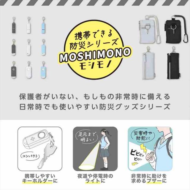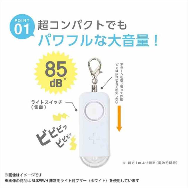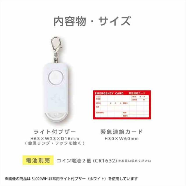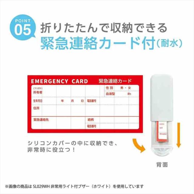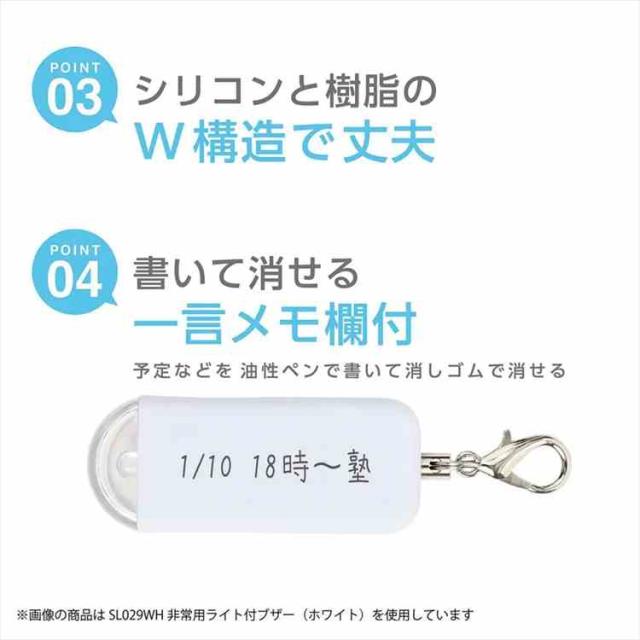 超コンパクトで大音量のライト付きブザー。足元まで明るく照らせるLEDライトは点灯・点滅の2段階。シリコンと従時のW構造で丈夫なシリコンカバーには書いて消せる一言メモ欄が付き。付属の緊急連絡カードは折りたたんでシリコンカバーの中に収納できて非常時に役立ちます。キーホルダーフックが付いているのでバッグなどに取り付けに便利◎ピンは抜けきらないので紛失しないのも嬉しいポイント。通学・通勤のお供におすすめです。