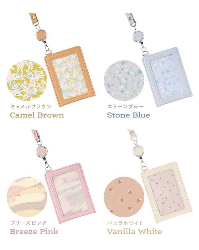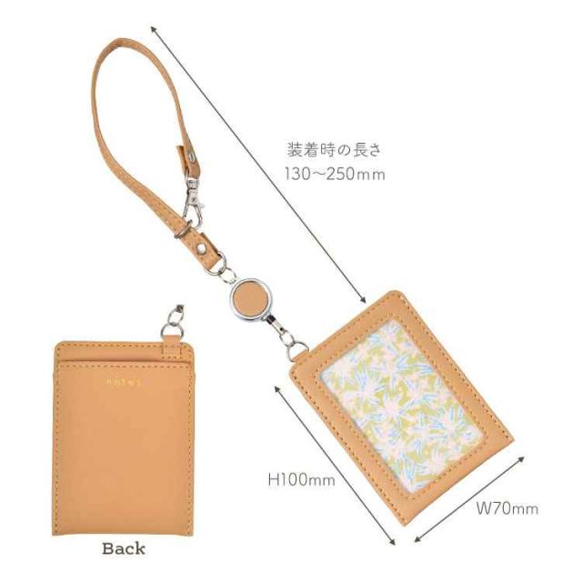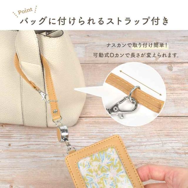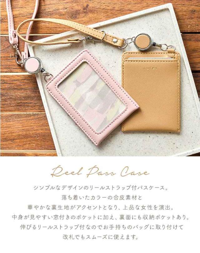 伸びるリールストラップ付きパスケース。窓付きのカードポケットと裏面ポケット付きでカードが2枚収納可能◎落ち着いたカラーの合皮素材と華やかな裏生地がアクセントの上品なデザインで、通勤・通学にぴったりです。