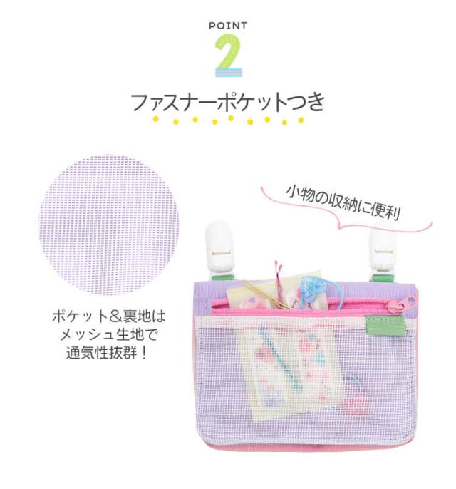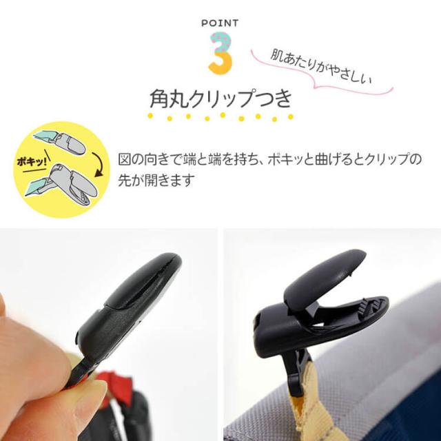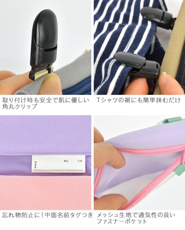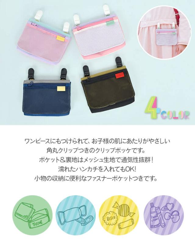 ワンピースにもつけられて、お子様の肌にあたりがやさしい角丸クリップつきのクリップポッケです。