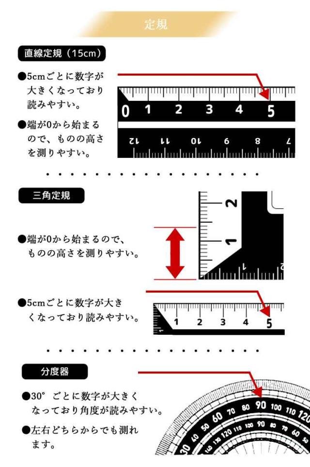 直線定規(15cm)、直角三角定規、直角二等辺三角形定規、分度器
