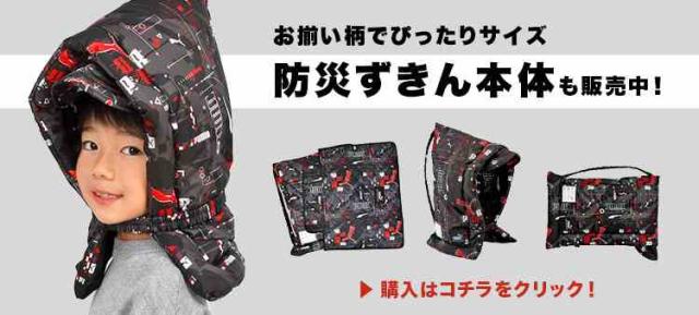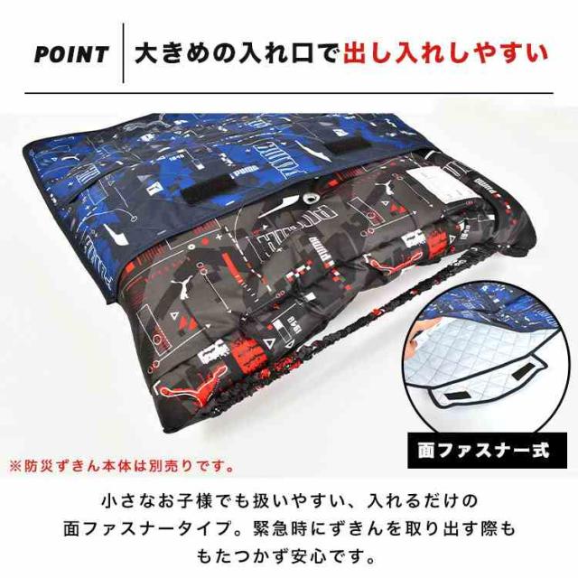 別売りの防災ずきんとお揃いのPUMA柄カバー。平常時にずきんを背もたれやざぶとんとして使用する際、より快適に使っていただけます。取り出し口が大きいので、ずきんを実際に使う緊急時ももたつかず安心です。お揃い柄でぴったりサイズの防災ずきんも別売しております!