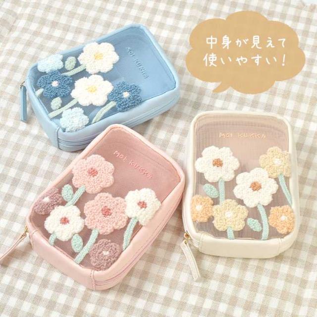 ポーチ 小物入れ 小さめ かわいい おしゃれ 花柄 北欧 ミニポーチ レディース 化粧 コスメ メイクポーチ メッシュ 自立 縦型 コンパクト 軽量 ガジェットポーチ モバイルバッテリー ケーブル収納 携帯用 旅行 アイボリー ピンク ブルー 水色 刺繍 女性用 プレゼント ギフト