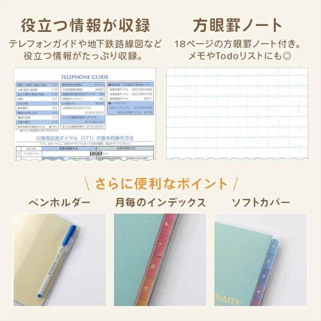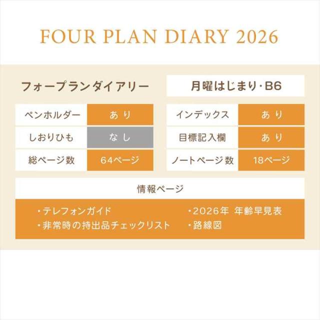 ![]() ![]() ![]() 左ページは予定を把握しやすい月間ブロックタイプ。 ![]() 複数の予定を同時に管理できるので、家族の予定や献立などの管理にぴったり! ![]() 見開きでまとめて管理できる年間スケジュール表もあります。 ![]() 目標設定と月間集計表付きでコンパクトに管理できます。 ![]() 方眼ノート、テレフォンガイド、路線図、役立つ情報がたっぷり!便利なペンホルダー、毎月のインデックス、ソフトカバー付きです。 ![]() ![]() ![]() ![]() →A5サイズはこちら ![]() ![]() Details 【フォープランダイアリー B6】 見開きで月間ブロックと4項目の予定が見れるダイアリー。 左ページがマンスリーで1ヶ月の予定を把握しやすく、右ページの4プランリストで4項目の予定が書き込めます。 仕事のプロジェクト、勉強、趣味、家計簿、献立の記録など、並行したり種類別に書き込みたいことがあるときにとっても便利。家族の予定も書き込めるので家族ダイアリーとしてもぴったりです。 表紙とインデックスは金の箔押し入り。シンプルで可愛いスケジュール帳です。 品番 RFD2655A / RFD2655M / RFD2655V サイズ 約H187×W128×D5mm 重量 約115g 素材 カバー:PVC 生産国 日本 ご注意 ※表記サイズより、多少の誤差があることがございます。 ※商品の画像はできる限り実物に近づけるよう配慮しておりますが、お使いのモニターやご覧になる環境によりましてはカラーの見え方に差が出る場合がございます。ご了承くださいませ。 ※メール便発送の場合タグを切ってパッケージから出して発送する場合があります。ご了承くださいませ。 関連キーワード diary くすみカラー パステルカラー 水色 緑 ミント 4人分 家族の予定 趣味 プライベート 献立 種類別 イヤープラン 方眼ノート リスト 薄型 持ち運び 10代 20代 30代 40代 50代 60代 中学校 高校 大学 中学生 高校生 大学生 先生 学生 学校 通学 通勤 女性 女子 女の子 誕生日 プレゼント プチ ミニ ギフト 母の日 父の日 おしゃれ オシャレ お洒落 かわいい 可愛い カワイイ シンプル 手帳 2026年 B6 マンスリー ダイアリー フォープランダイアリー 12月始まり 1月始まり 4月始まり スケジュール帳 レイメイ藤井 家族手帳 ノート 家計簿 管理 仕事 月曜始まり 月間 1ヶ月 デイリー 4項目 薄い スリム コンパクト 小さめ ファミリー手帳 家族ダイアリー ミニ 複数 予定 勉強 記録 目標設定 インデックス ペンホルダー ソフトカバー 箔押し ブルー ピンク グリーン | |||||||||||||
