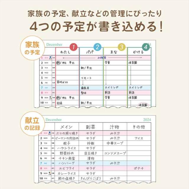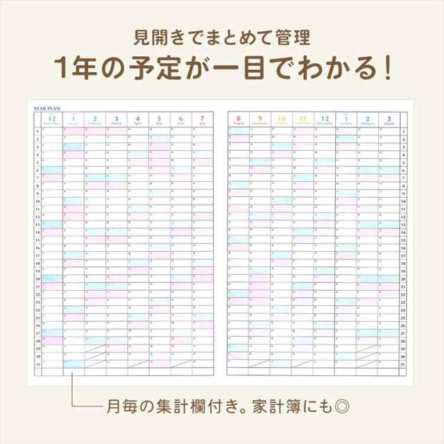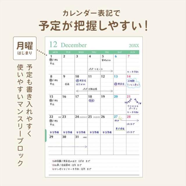 見開きで月間ブロックと4項目の予定が見れるダイアリー。 左ページがマンスリーで1ヶ月の予定を把握しやすく、右ページの4プランリストで4項目の予定が書き込めます。 仕事のプロジェクト、勉強、趣味、家計簿、献立の記録など、並行したり種類別に書き込みたいことがあるときにとっても便利。家族の予定も書き込めるので家族ダイアリーとしてもぴったりです。 表紙とインデックスは金の箔押し入り。シンプルで可愛いスケジュール帳です。