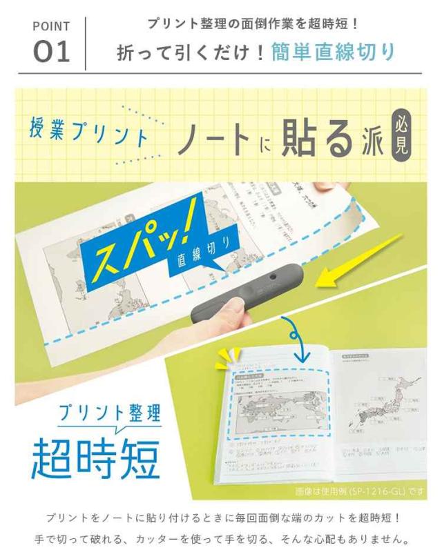 授業プリントをノートに貼る派、必見!はみだす部分を折って綺麗にカットできるプリントカッターとマルチに使える小さいはさみがセットになって新登場。プリント整理を時短して、毎日の勉強を効率的に。