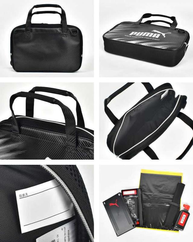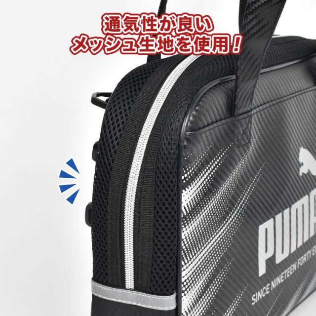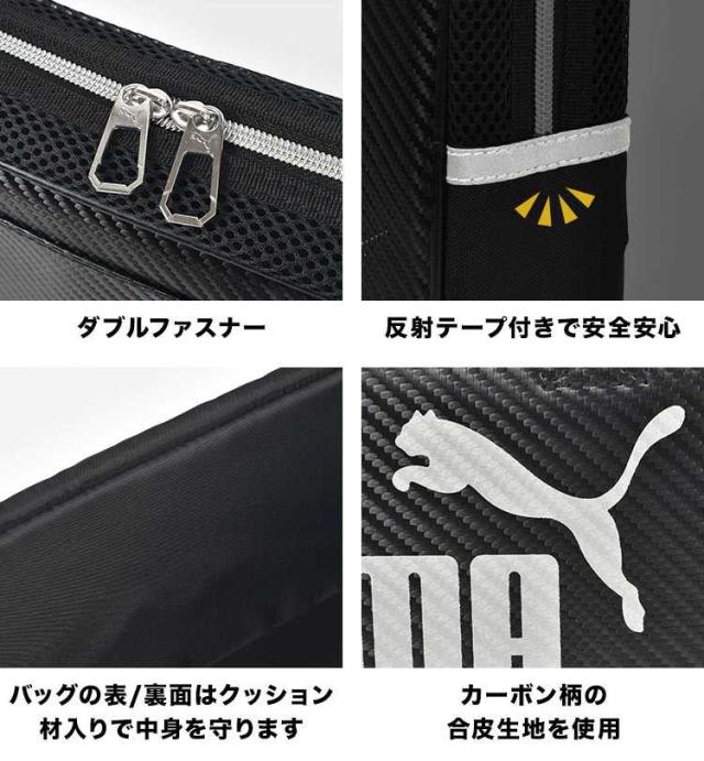 疾走感のあるスポーティーなドットグラデーションデザインがかっこいい、PUMAの書道セット。通気性の良いメッシュ生地を使用しているので衛生面も◎取り外し可能なショルダーベルト付き。バッグはカーボン柄の合皮生地を使用。バッグの表面と裏面はクッション材入りで中身を守ります。バッグのサイド部分には反射テープ付きなので暗い道でも安全安心。