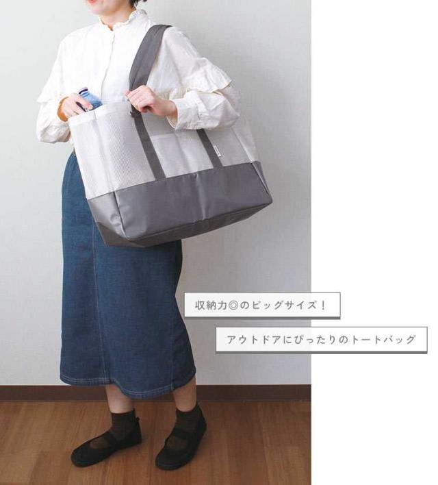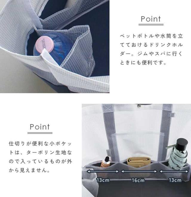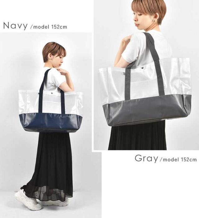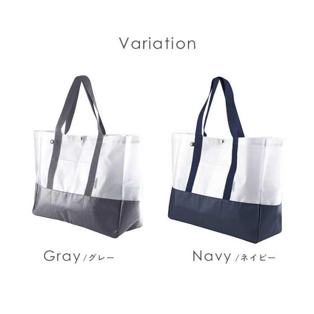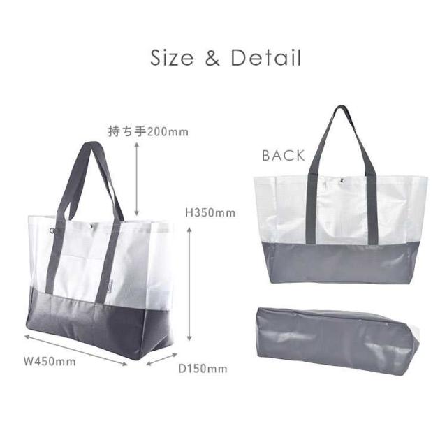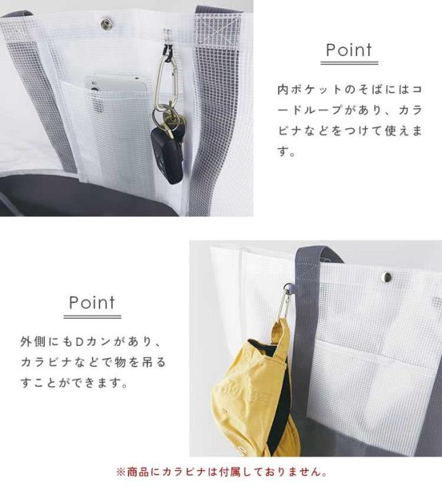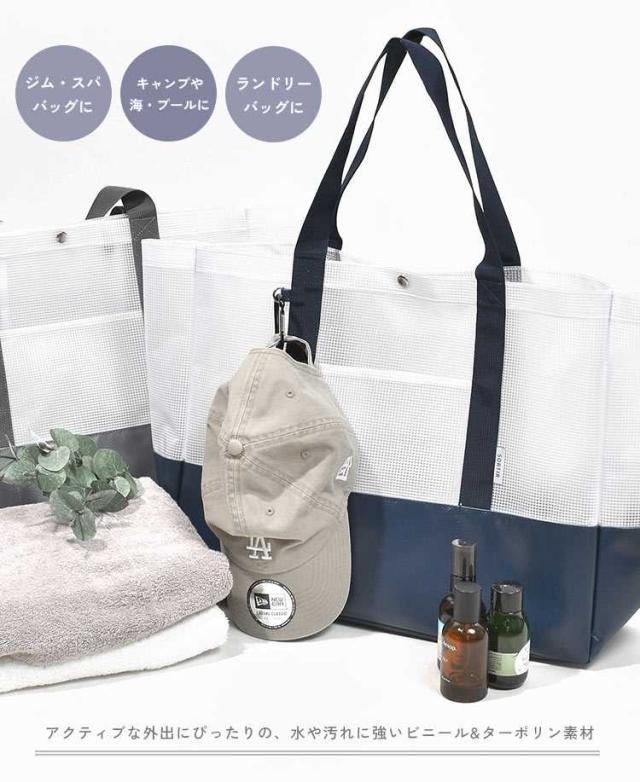 半透明のビニールメッシュとターポリン生地を組み合わせた大きめサイズのトートバッグ。地面に接する底部分を丈夫なターポリンに切り替えているので水や汚れが気になりません。多数の仕切りポケットやボトル立て、カラビナが付けられるDカンやコードループなど便利な機能もたくさん!海やプール、キャンプなどのレジャーやスポーツ観戦などのアクティブなお出かけにぴったりです。