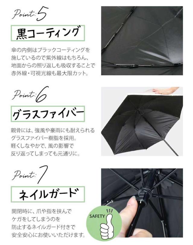 ブラックコーティングが照り返しも吸収し、紫外線・赤外線・可視光線も最大限カット!涼しく快適で、熱中症対策にも◎ まあるい「美シルエット」の折りたたみ傘。折り傘特有の角張ったシルエットを丸くてかわいい美シルエットに改良しました◎晴雨兼用で突然の雨にも対応!これ1本で、晴れの日も雨の日も毎日使えます◎