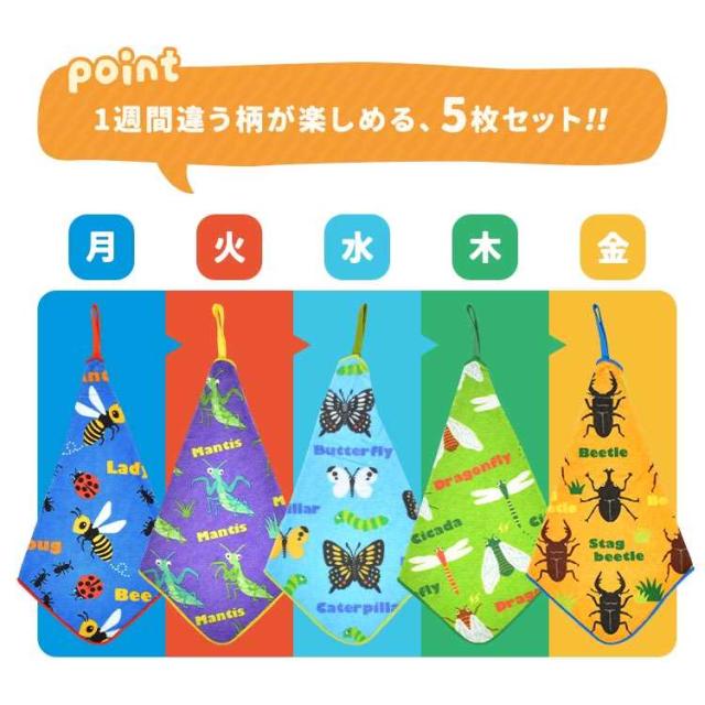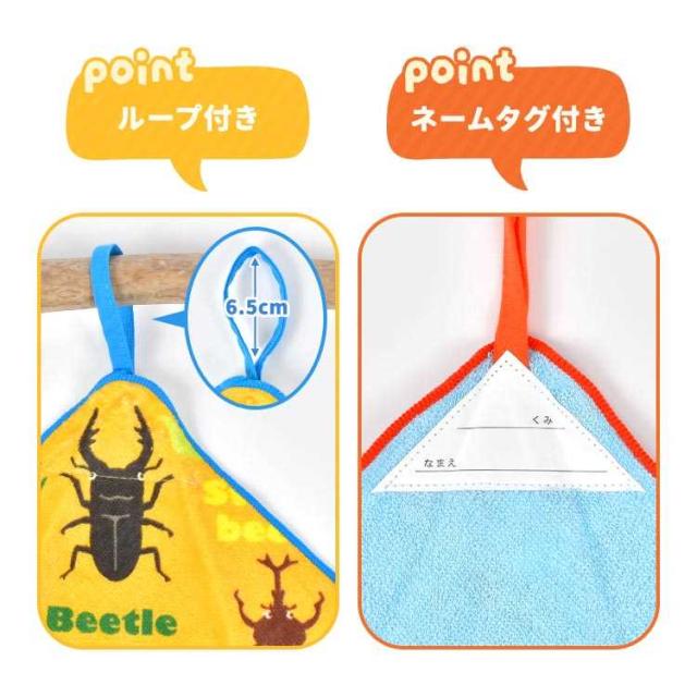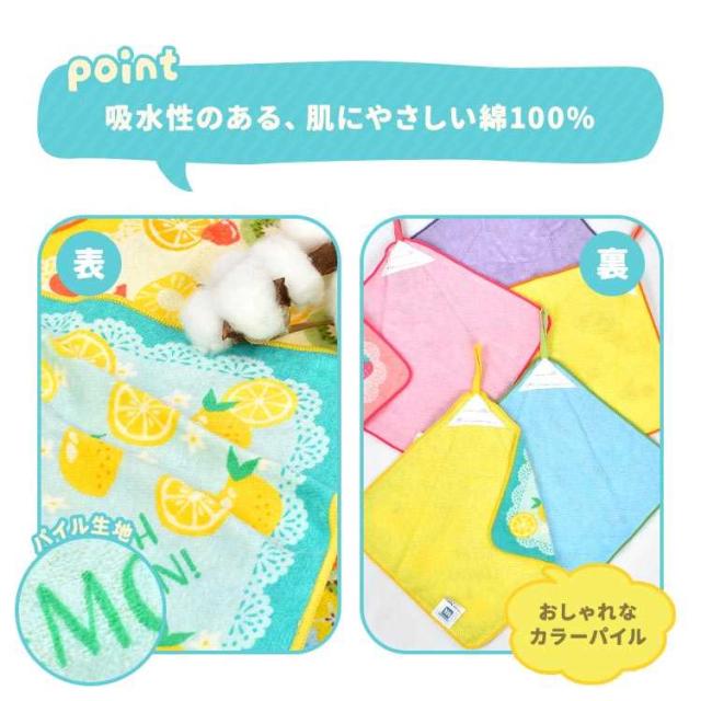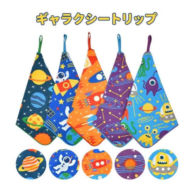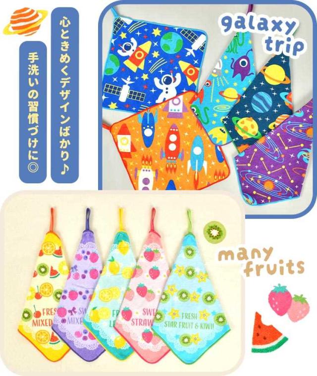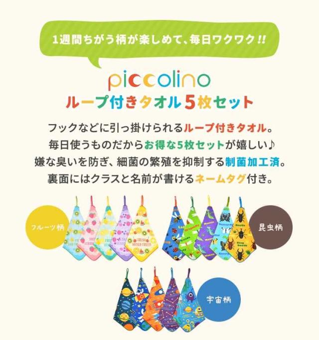 ループタオル 5枚セット 保育園 幼稚園 子供 キッズ 女の子 男の子 フルーツ 昆虫 宇宙 タオル ループ付き 手拭き 口拭きタオル 大きめ 25cm 制菌加工 ネームタグ 綿 パイル地 ハンドタオル ハンカチ おしぼり ピッコリーノ おしゃれ かわいい カラフル 子ども 入園 準備