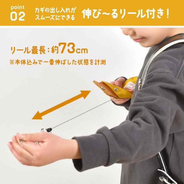 ・リール式で紐が伸び、ランドセルに付けたまま鍵の開け閉めが可能。