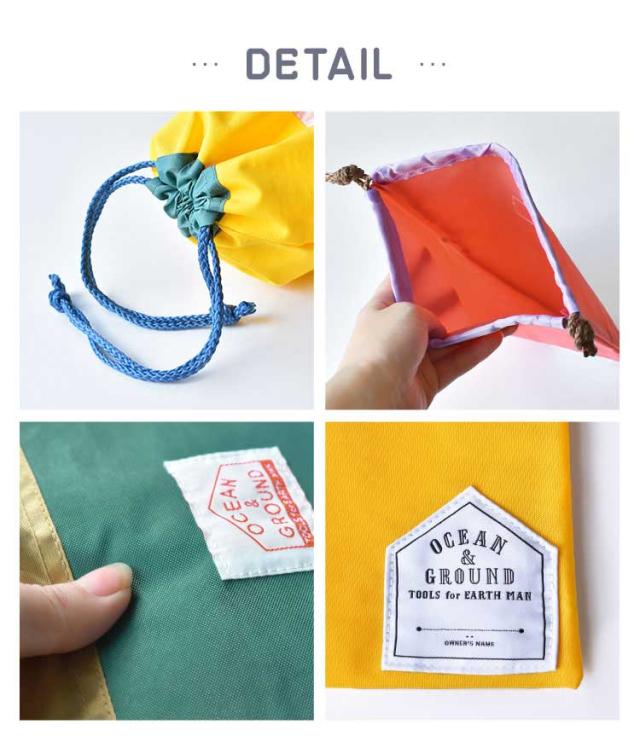人気のocean&groundからポップなカラーの巾着袋が登場!! お子様の通学グッズとして、ママのポーチとして使い方いろいろ!旅行の時もあると便利。豊富なカラー展開で、家族や友達とお揃いも◎ 汚れてもさっと拭けるよう、丈夫で水にも強いナイロン100%素材を採用。 一見色ムラ?のように見えるものは、風合いを出すため染色後ウォッシュをかけた、ウォッシュナイロンという加工です。ふんわりとしたマーブルのような色がとっても可愛い!