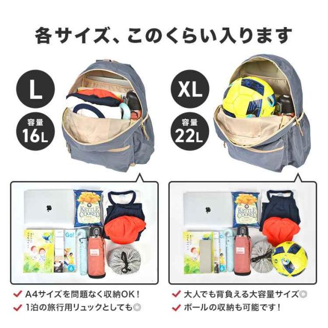・サイズ展開が拡充され、Lサイズ(約16L)とXLサイズ(約22L)が登場。成長やシーンに合わせて選べるようになりました。