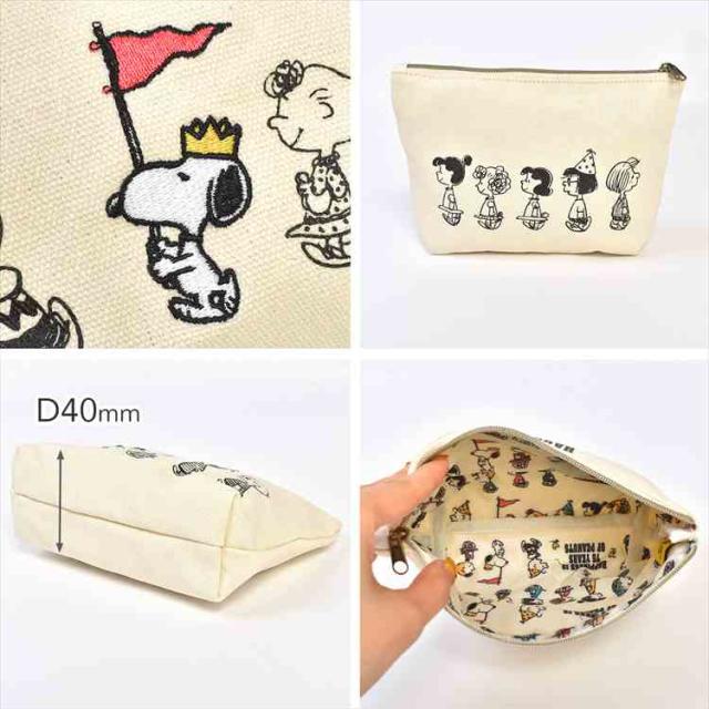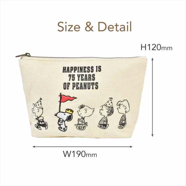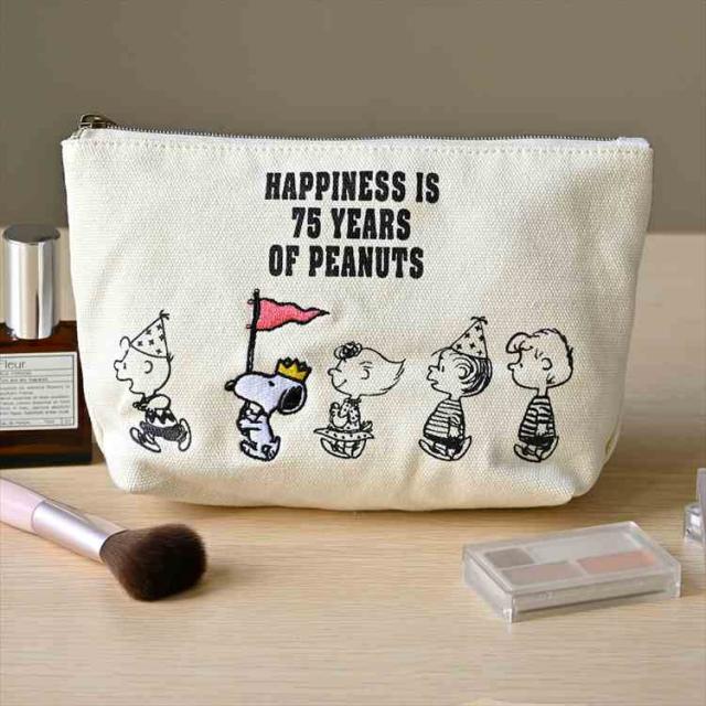 75周年のアニバーサリー柄が可愛い!スヌーピーたちのキャンバスミニポーチ。コスメポーチにちょうどいいマチつきの小さめサイズです。ちょっとしたプレゼントにも◎