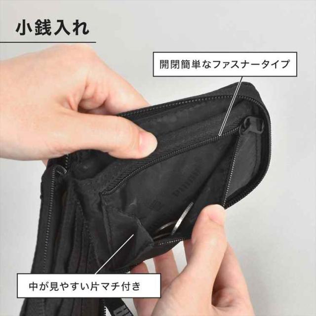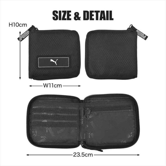 スタイリッシュで使いやすい PUMAのジップウォレット。お札入れ・小銭入れ・カードポケット×3・フリーポケット×2を備えた、コンパクトながら収納力のある二つ折り財布です。小銭入れは開閉が簡単なファスナータイプでスムーズに取り出せます。シンプルで長く使えるデザインで、キッズから学生にオススメです。