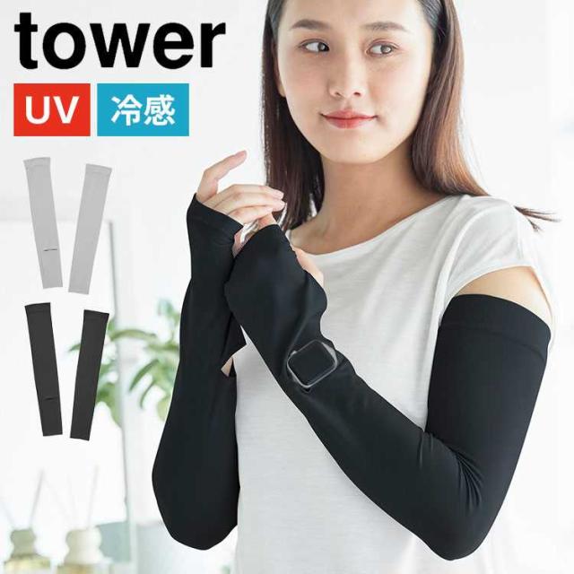 リバーシブルで使えるアームカバー タワー 山崎実業 アームカバー uv 冷感 レディース メンズ tower 夏 ひんやり UVカット リバーシブル ロング丈 公式 10211 10212 ライトグレー ブラック 紫外線対策 日焼け対策 時計が見える 時計スリット 接触冷感 手袋 腕カバー 運転