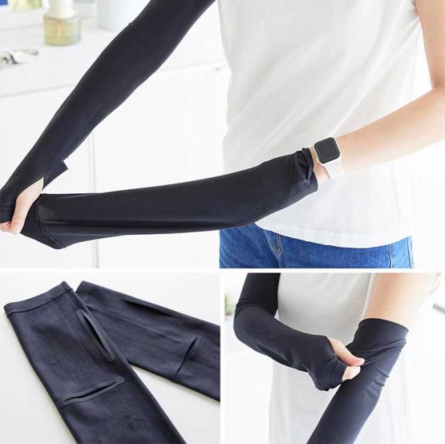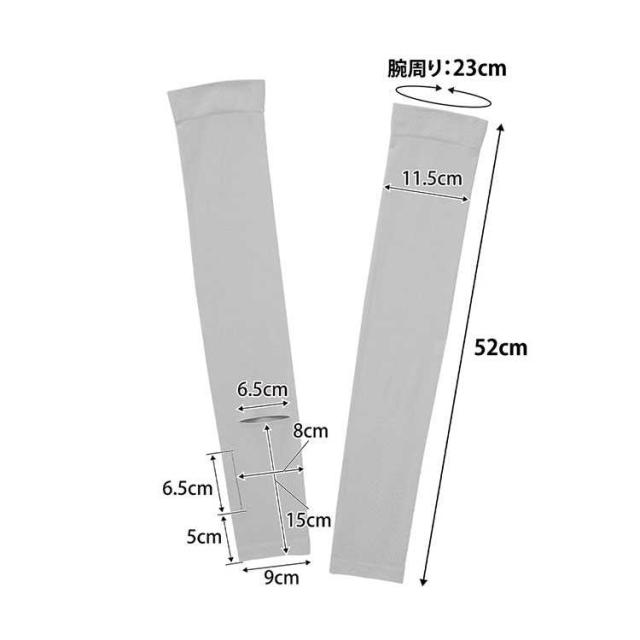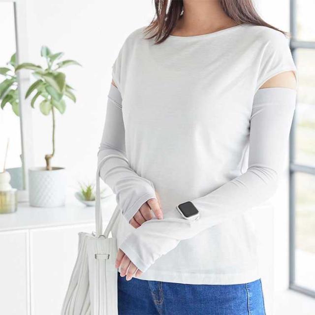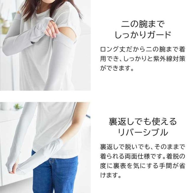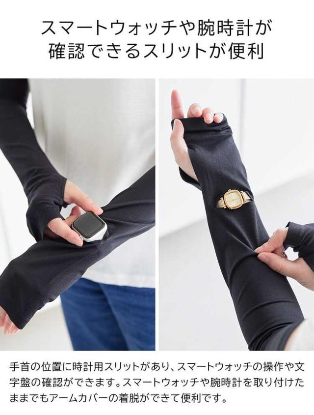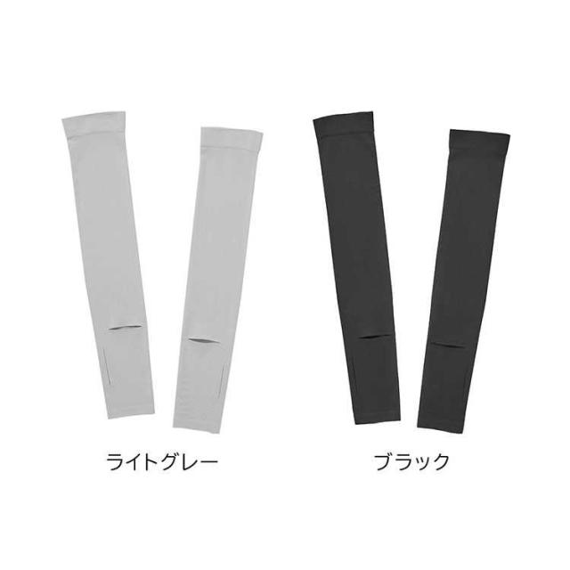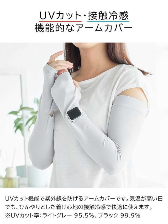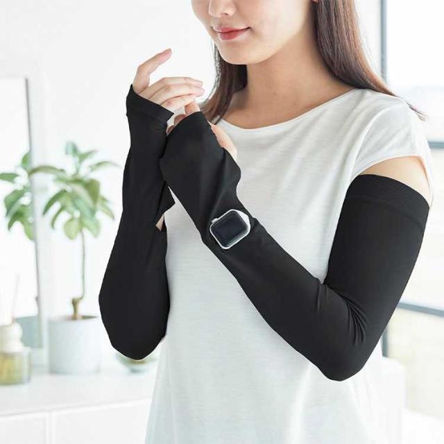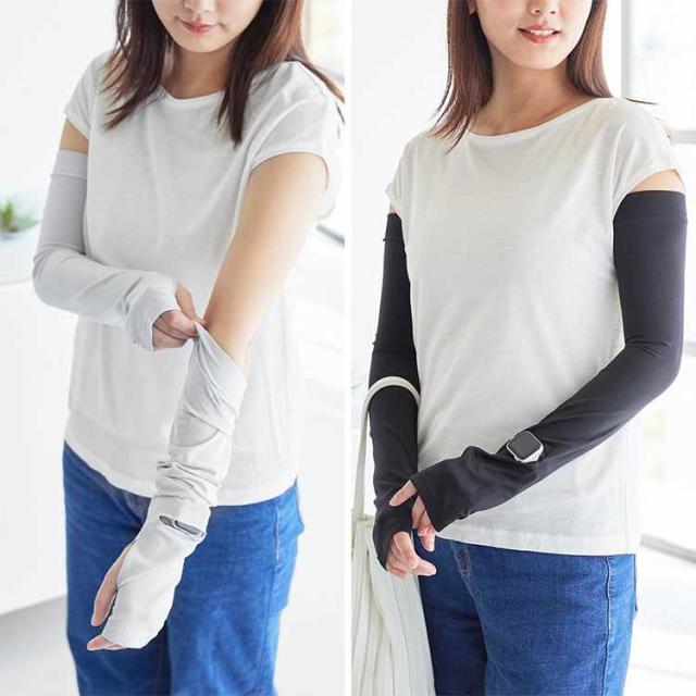リバーシブルで使えるUVカット機能付きアームカバー。時計用スリットが入っているのでスマートウォッチの操作が可能で便利です。ロング丈なので二の腕まで紫外線対策ができ、 肌に触れた時にひんやり冷たい接触冷感機能付き。両面ともに使用可能で、裏返す手間がなく使用できます。UVカット率95.5%(ライトグレー)・UVカット率99.9%(ブラック) 洗濯機OK。