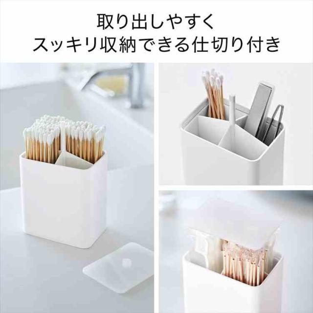 蓋を押すだけの簡単開閉で、綿棒が取り出しやすいポップアップ式ケースです。綿棒の先端に触れずに取り出せるので衛生的。半透明の蓋で残量がわかりやすく、取り外しも可能で補充もスムーズ。仕切り付きなので、ケア用品を種類ごとにスッキリ収納できます。