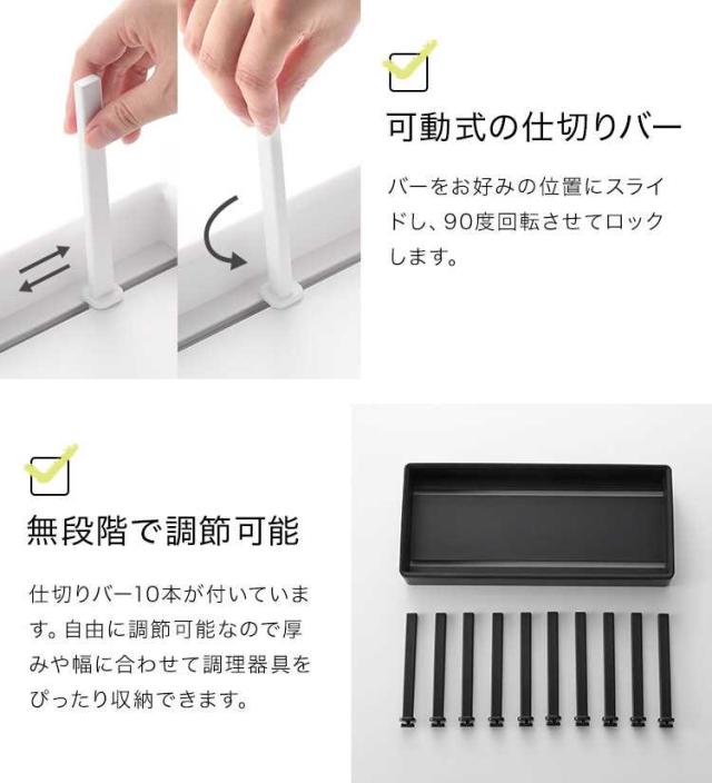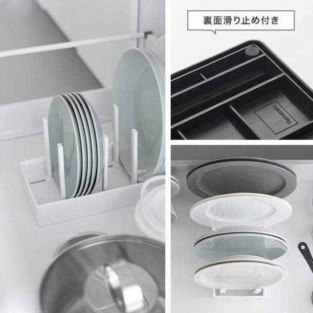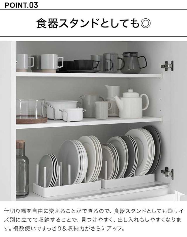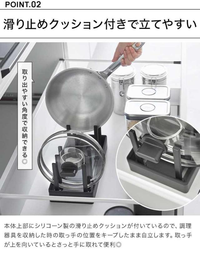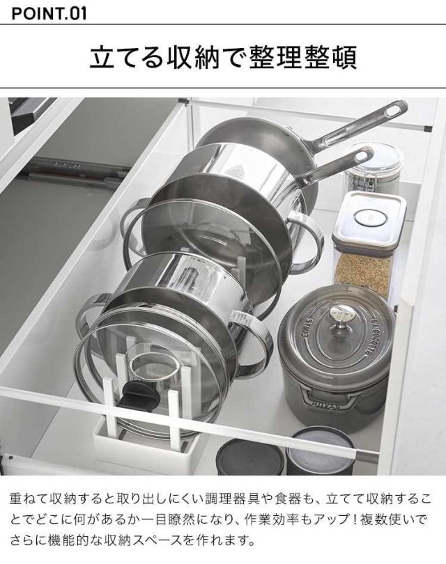 鍋蓋やフライパンのサイズに合わせてスライドできる可動式の仕切りバーが便利な幅32cmの収納スタンド。シリコーン製の滑り止めクッションが付いているので、フライパンなど収納時の取っ手位置のまま自立してくれます。製品の裏面にも滑り止めが付いているので、引き出しの開閉時にずれにくくキズから守ります。仕切り幅を自由に変えることができるので、食器スタンドとして食器棚への設置もおすすめです。