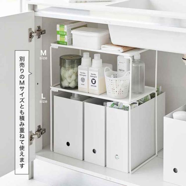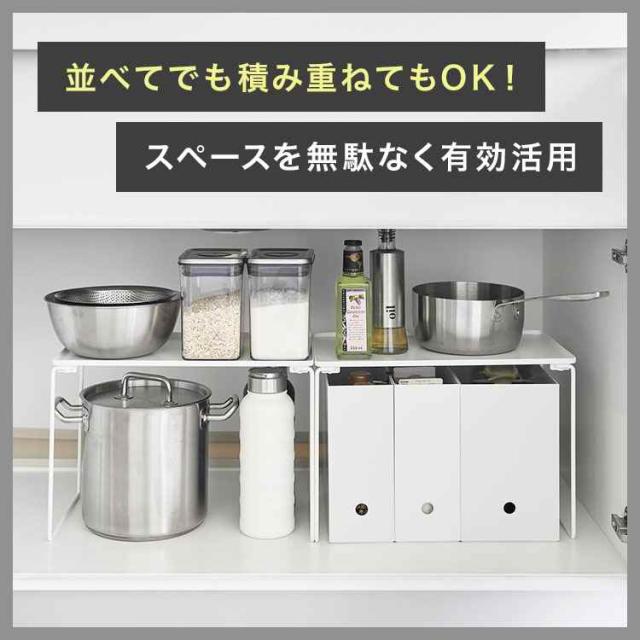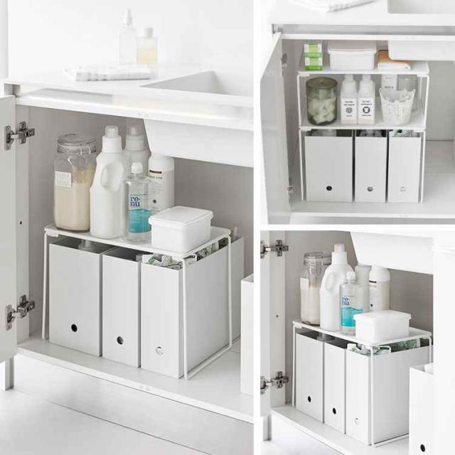 キッチンや洗面所のシンク下のスペースを有効活用。積み重ねても並べても使える棚。シンク下のスペースを無駄なくスッキリ整頓でき、棚はフチ付きなので収納物の落下を防止してくれます。キッチンシンク下では、高さのある鍋や収納に使うファイルボックスがスッキリ収まるサイズ感です。シャンプーや洗濯洗剤などのストック収納として、洗面シンク下への設置もおすすめです。使わない時は折り畳んでスリムに収納できます。